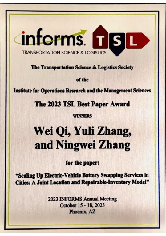 On October 16,2023, the annual meeting of the Institute for Operations Research and the Management Sciences(INFORMS) announced various awards in the field of Transportation Science and Logistics (TSL). The paper "Scaling Up Electric-Vehicle Battery Swapping Services in Cities: A Joint Location and Repairable-Inventory Model" submitted by Associate Professor Qi Wei, Tsinghua University, Zhang Yuli and his doctoral student, Zhang Ningwei, won the TSL Best Paper Award. Zhang Yuli is the corresponding author and co-first author of the paper.