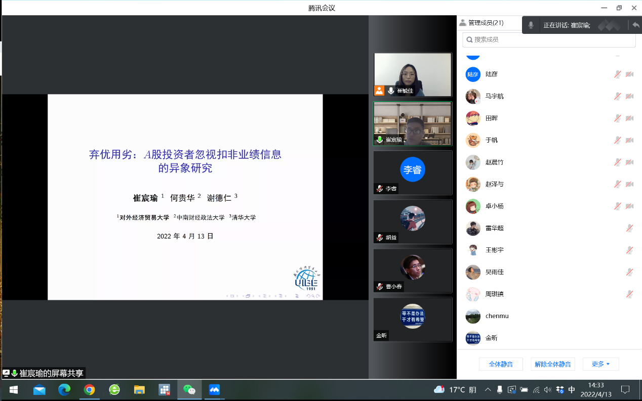 On April 13, 2022, [Mingli Lecture 2022 No. 20] was honored to invite Assistant Professor Cui Chenyu from the School of International Business, University of International Business and Economics to give a presentation entitled "Abandon the Good and Use the Bad: A-Share Investors Ignore Deductions for Non-Performance Information" The Visionary Study” report. Affected by the epidemic, this report will be held online. More than 20 teachers and students, including teachers and graduate students from the School of Management and Economics, participated in the report. The host is Assistant Professor Cui Yujia, Department of Accounting, School of Management and Economics.