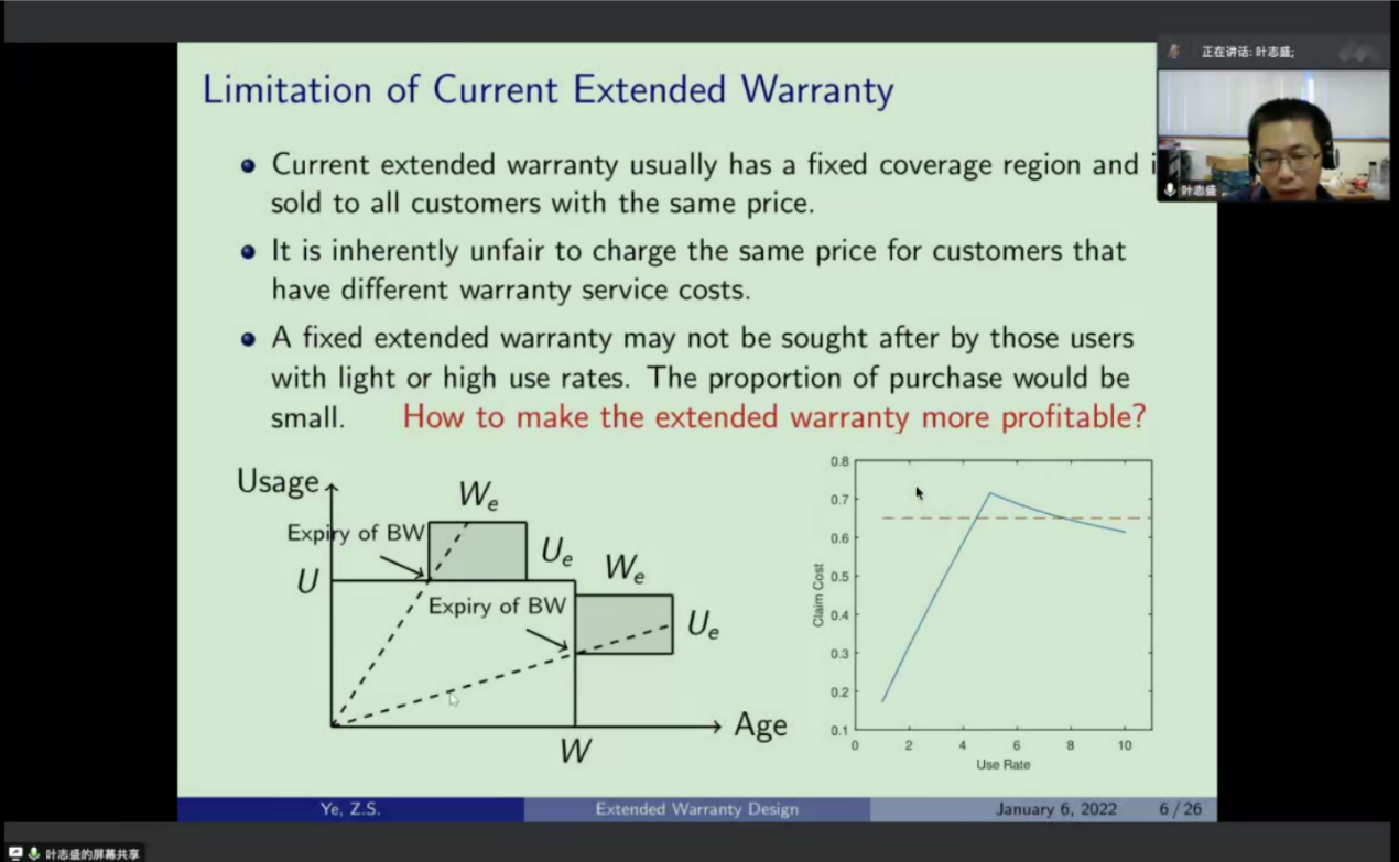 Mr. Ye Zhisheng first introduced the relevant two-dimensional extended warranty strategy through the background of automobiles. Existing 2D extended warranties are generally sold to all customers with a fixed coverage area and the same price. However, since different customers have different usage rates and product failure histories, customers are heterogeneous, which will significantly impact extended warranty costs. Mr. Ye Zhisheng introduced a personalized extended warranty strategy that considers customer usage rate, and built a warranty cost model under this strategy to calculate the manufacturer's expected maintenance cost and profit, so as to determine the optimal price of customized extended warranty. On the basis of this model, Mr. Ye Zhisheng further introduced a warranty strategy that comprehensively utilizes customer usage rate and product failure history information. Finally, Mr. Ye Zhisheng showed the numerical experiment results of the model to compare and analyze the two warranty strategies shown in the report and the existing fixed area warranty strategies. The results show that the customized warranty strategy is superior to the existing warranty strategy in terms of fairness, flexibility and profitability.