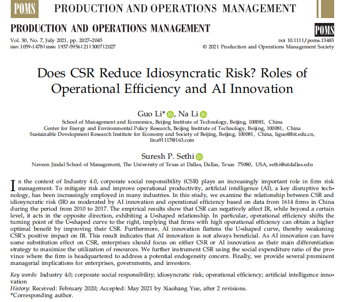 Recently, the research results of Professor Li Guo's team of the School of Management and Economics, Beijing Institute of Technology “Does CSR Reduce Idiosyncratic Risk?Roles of Operational Efficiency and AI Innovation” is officially published in Production and Operations Management, an international top journal of management science.The work was conducted by Professor Lee Guo and his PhD student Li Na with Professor Suresh P. Sethi, University of Texas, Dallas, USA.