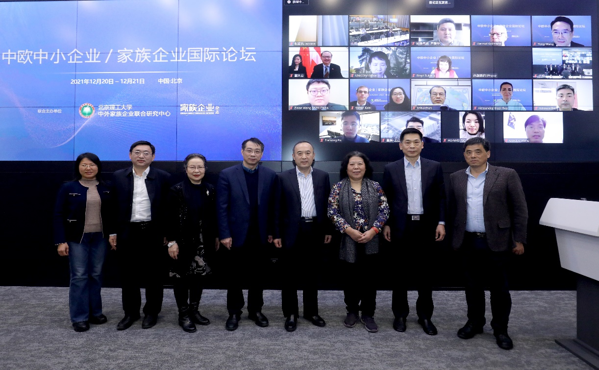 On December 20,2021, Beijing Institute of Technology Chinese and foreign family enterprise joint research center and family enterprise magazine jointly organized "2021 China-Europe small and medium-sized enterprises / family business forum: innovation entrepreneurship and cooperation development". Deputy secretary of Beijing institute of technology Qin Zhihui gave a speech on behalf of the school. The Chinese embassy in Austria technology counselor lei FengYun, and deputy secretary of China SME international cooperation association zhang XiaoHui attended the forum and made a speech. Professor Pei Rong, director of the family enterprise joint research center of the school of management and economics, Professor Zhang ji-hai, Professor Meng Fanchen, Associate Professor Wang HuaiYu and Dr Wang GangBo shared their views. The meeting strictly complied with the latest epidemic prevention requirements, and adopted offline and online methods. The offline conference venue was Room 240, the main building of Beijing Institute of Technology. The online conference was held by ZOOM, and the whole process was simultaneous translated to ensure smooth online and offline communication.