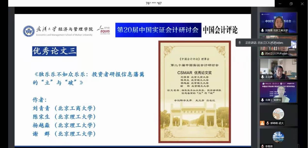 The China Empirical Accounting Seminar is the highest level academic conference in the field of empirical accounting in China. It was initiated and organized by the China Accounting Review Council of more than 20 world-class construction universities such as Peking University, Tsinghua University, Fudan University and Shanghai Jiao Tong University.After four rounds of completely anonymous evaluation and scores by dozens of experts, three outstanding papers were selected and commended from the 228 high-level Chinese and English papers submitted by many domestic "double first-class" construction universities and overseas famous universities and scholars.