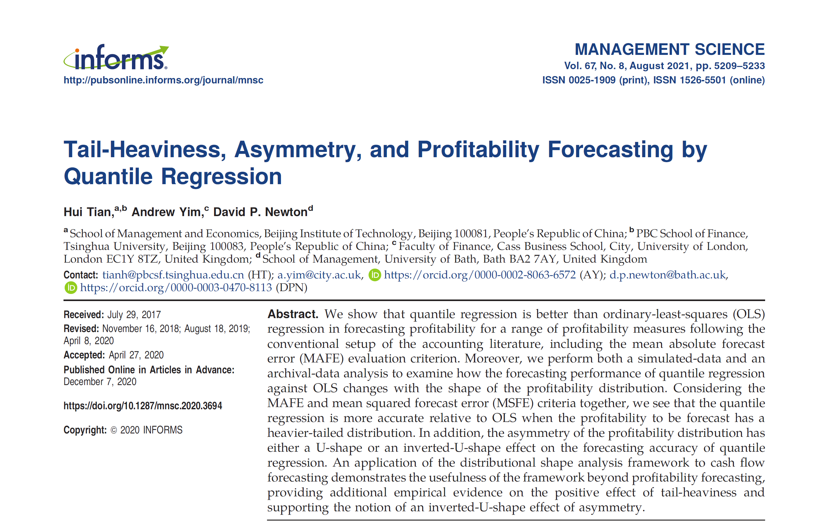 Recently, Mr. Tian Hui from the Department of Accounting of our school, Professor Andrew Yim of Cass Business School, and Professor David Newton of the University of Bath, published a research paper entitled "Tail-Heaviness, Asymmetry, and Profitability Forecasting by Quantile Regression" in Management Science, a top journal of management.