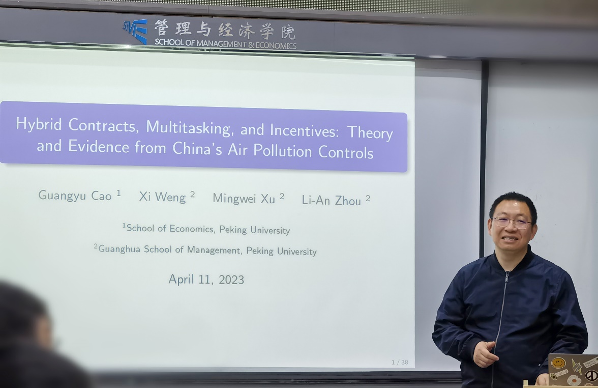 At the invitation of the School of Management and Economics, Professor Weng Xi of Guanghua School of Management delivered an academic report entitled Hybrid Contracts, Multitasking, and Incentives: Theory and Evolution from China's Air Pollution Controls at 2 p.m. on April 11, 2023 in Conference Room 317 of the main building. The lecture was presided over by Professor Yan Zhijun, and many teachers and students from the college attended the lecture.