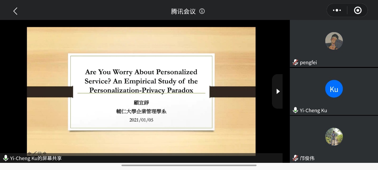 On January 6, [Mingli Lecture Hall, 2021, 3rd Issue] had the honor to invite Professor Yi-Zheng Ku from Fu Ren Catholic University in Taiwan to bring you the academic report titled "Are You Worried About Personalized Service? An Empirical Study of the Personalization-Privacy Paradox" . Professor Yan Zhijun of the college presided over the meeting and extended a warm welcome to Teacher Gu.