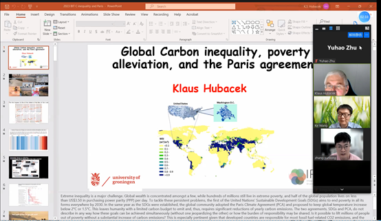 On May 24, 2023, Professor Klaus Hubacek of University of Groningen in the Netherlands was invited to give an online academic report entitled "Global Carbon inequality, power alliance, and the Paris agreement". The report will be chaired by Professor Wang Ke, with over 50 teachers and students from the center and college attending. Professor Klaus Hubacek discussed in the report how the COVID-19 unintentionally promoted the realization of the goals of the Paris Agreement, and whether the government could lift millions of people out of poverty without significantly increasing carbon emissions. In addition, the report also discusses the impact of the EU's green agreement and the current rise in energy prices on global income distribution, as well as whether there is any room for improvement in carbon taxes when the Cost of living crisis and income gap are already large. The research content covered in the report is of great significance for global carbon reduction, poverty reduction, carbon inequality reduction, and achieving sustainable development. After the report, the teachers and students of the center and college had in-depth exchanges and discussions with Professor Klaus Hubacek on carbon inequality and poverty issues.