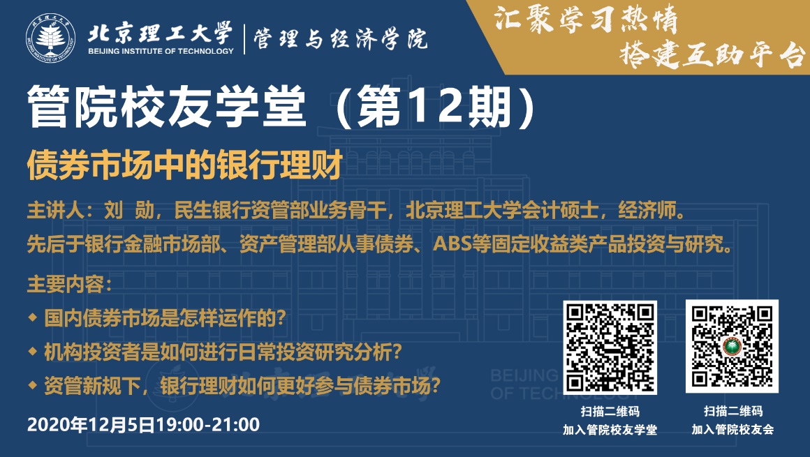 On December 5,2020, Mr.Liu Xun from the Asset Management Department of China Minsheng Bank was invited to give an online lecture entitled "Bank Financial Management in the Bond Market".Mr.Liu Xun graduated from the master's degree project in accounting of the college, and has been engaged in the investment and research of fixed income products such as bonds and ABS in the Banking Financial Market Department and the Asset Management Department.