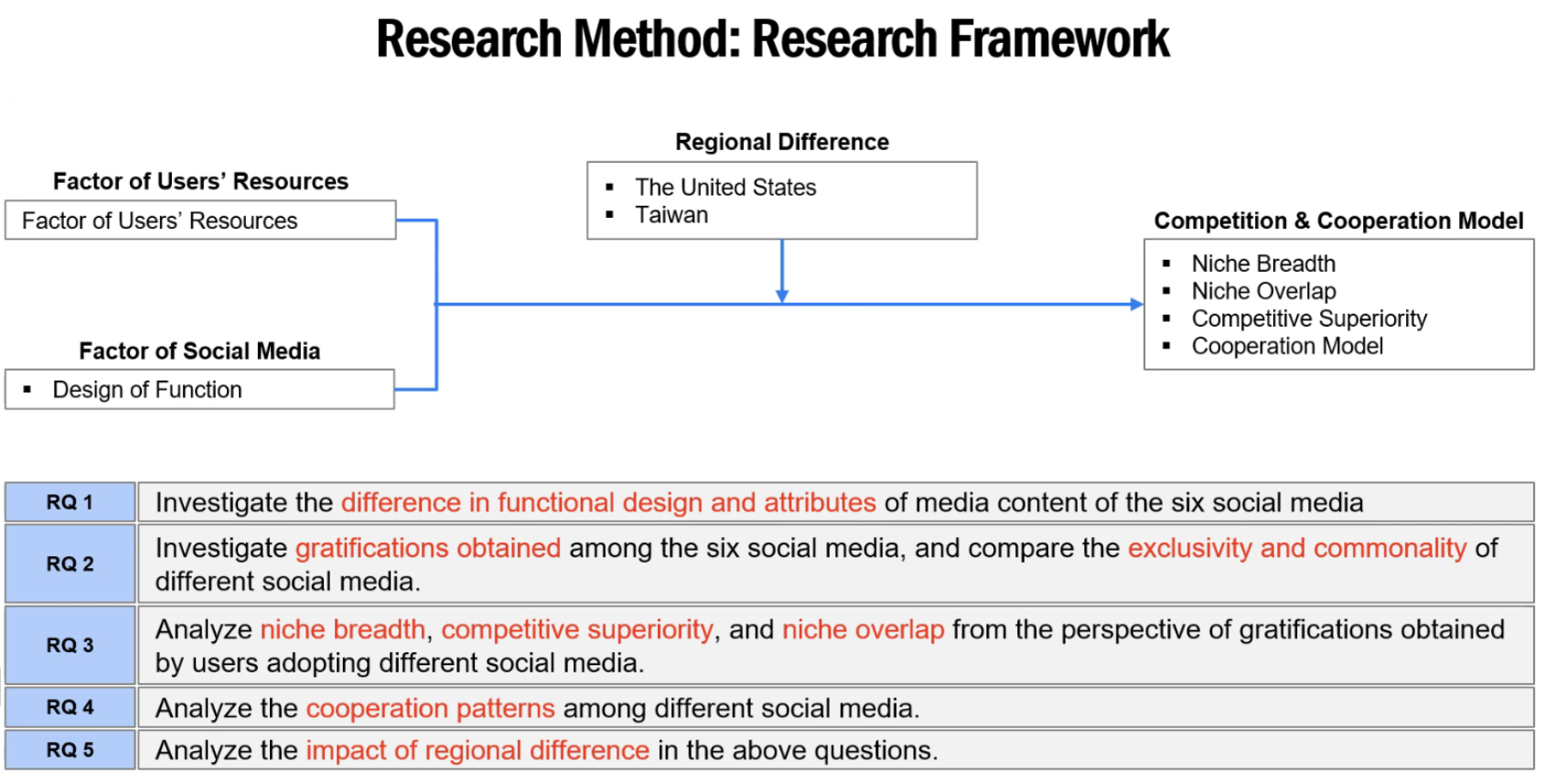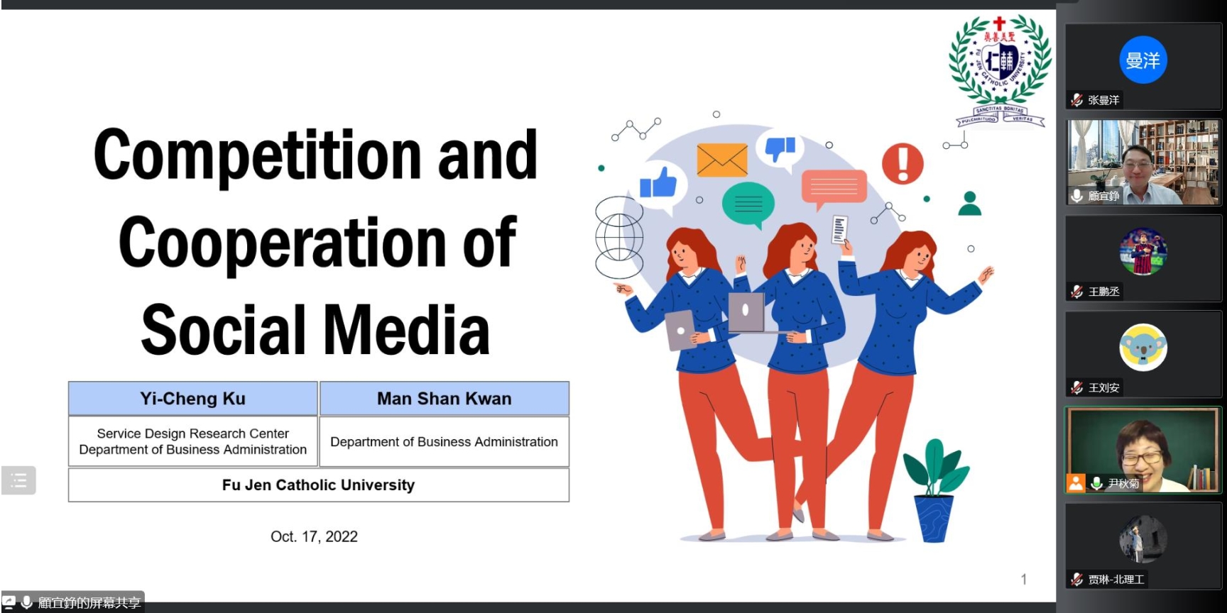 Professor Gu first introduced the relevant background of social media and explained the research motivation. Then it explains the research basis of social media adoption from three aspects: the content of information system and its value, the richness of social media content, and the utility of social media in interaction with people. On this basis, Professor Gu introduced the penetration of different social media, such as Wechat and Line, in different countries and regions, and introduced the ecological perspective to explore the relationship between competition and cooperation among social media. The homogeneity of social media is relatively serious, and there are many software with similar functions. Professor Gu takes the niche theory as the theoretical basis for his research, and uses this theory to explain the co-existence and competition between media. By studying the niche model and reciprocity model of Facebook, YouTube, Instagram, TikTok, WhatsApp and LINE, this paper discusses the competition and cooperation relationship of social media between the United States and Taiwan, China. Based on the results of 566 samples from two network surveys, factor analysis was carried out to summarize five important factors: sociality, entertainment, attention seeking, auxiliary tools and information.