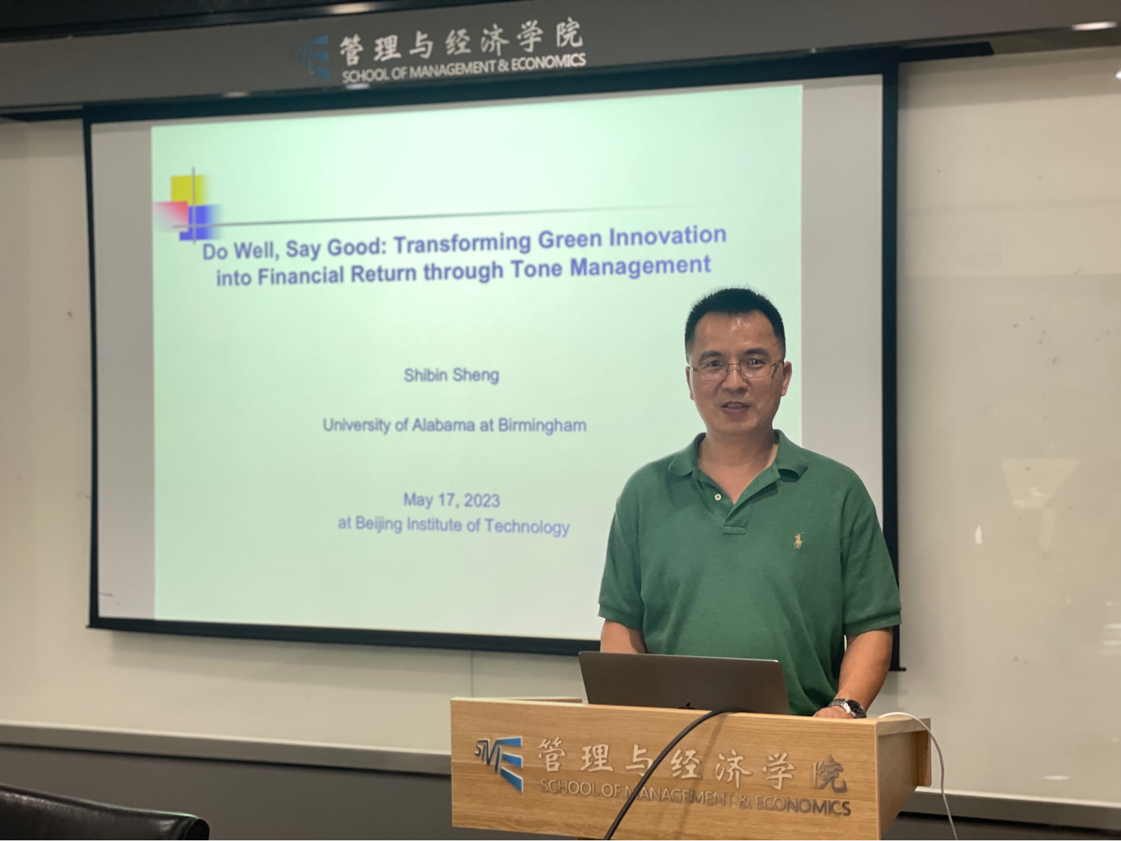 At 3:00 p.m. on May 17, 2023, Professor Sheng Shibin of the University of Alabama at Birmingham was invited to visit and gave an academic report entitled "Do Well, Say Good: Transforming Green Innovation into FinancialReturn through Tone Management". This report was chaired by Professor Wu Shuishui from the Marketing Department, and many teachers and students from the Marketing Department participated in and listened to the report.