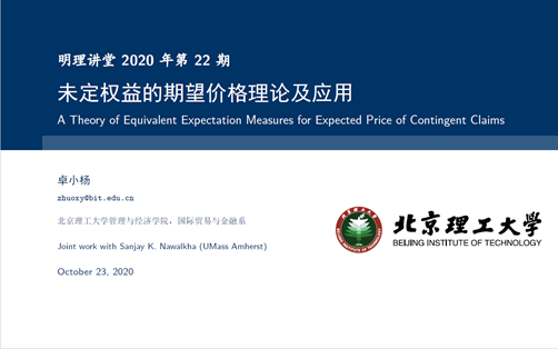On October 23,2020, Zhuo Xiaoyang, Special Associate Research fellow, Department of International Trade and Finance, School of Management and Economics, Beijing Institute of Technology, was invited to give an academic report entitled "A theory of equivalent expectation measures for expected price of contingent claims”. The host is Professor Zhang Lingxiang, Department of International Trade and Finance, School of Management and Economics, and the organizer is the Center for Scientific Research and academic Exchange, and the Department of International Trade and Finance.