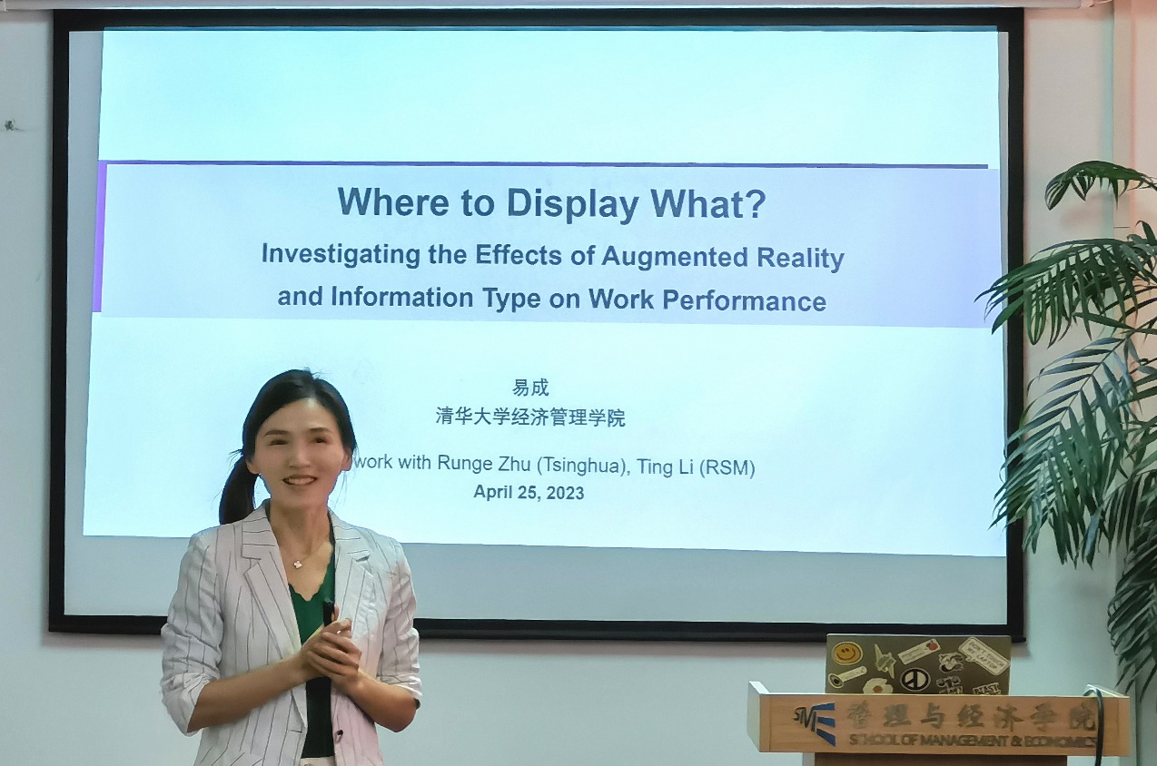 At the invitation of the School of Management and Economics, Yi Cheng, associate professor of the School of Economics and Management of Tsinghua University School of Economics and Management, gave an academic report entitled "Where To Display What? Investigating the Effects of AugmentedReality and Information Type on Work Performance" at 10 a.m. on April 25, 2023 in Conference Room 418 of the main building. The presentation was presided over by Associate Professor Wang Liu'an, and many teachers and students from the college participated in the presentation.