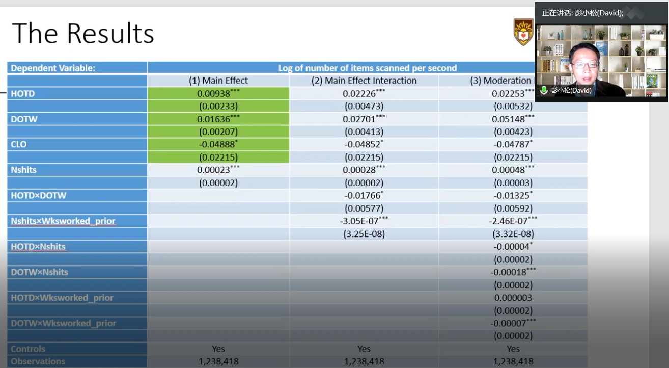 In the report, Professor Xiaosong (David) Peng first demonstrated that regular work arrangements are related to better rest and healthier lifestyles, thereby improving employee productivity based on the previous literature.Increasing productivity in turn helps solve the trade-offs associated with increasing working time regularity.Professor Xiaosong (David) Peng explored the impact of working regularity on cashier productivity and, in addition, validates the regulatory role of work experience between working regularity and cashier productivity.The results provide a basis for retailers to adjust their work arrangements and have some significance.The report aroused great interest from teachers and students, and launched a heated discussion and exchange, with a warm response, and was well received by the majority of teachers and students!