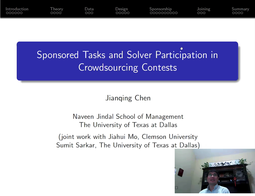 "Crowdsourcing Contest" refers to online crowdsourcing platforms, which provide a place for companies (seekers) seeking solutions to interact with individuals (solvers) who can provide solutions. Seekers obtain solutions from the solvers by publishing task requirements and setting bonuses. Professor Chen first introduced the relevant background and research motivation of online crowdsourcing platform in detail. With the continuous expansion of the online crowdsourcing platform, some task seekers worry that their tasks cannot attract enough participants, which makes it difficult to solve the tasks. In order to solve this problem, the crowdsourcing platform provides a separate publicity plan for the seekers. According to the plan, the seekers need to pay extra fees to highlight their tasks among many tasks, so as to attract the attention of the solvers. However, it is not clear whether this plan can really enhance the participation of the solvers. Professor Chen's work explored the impact of this publicity plan on the participation of solvers, analyzed the impact of this plan on the number of solvers attracted by the task, the number of high-quality solvers and the number of solutions, and explored the regulatory role of the number of bonuses, task process and the ability of solvers.