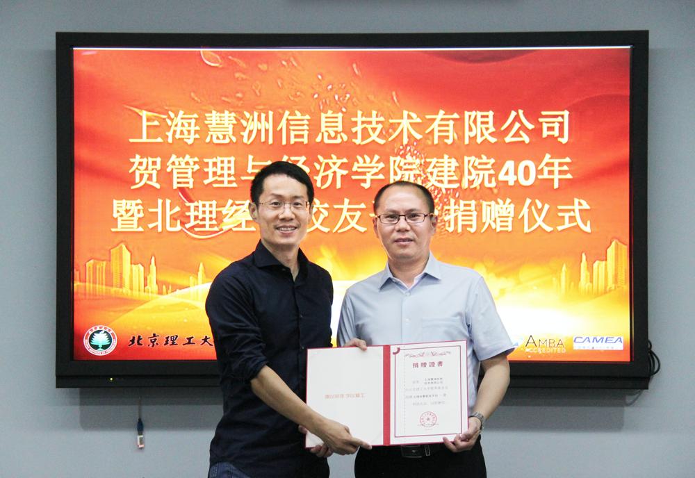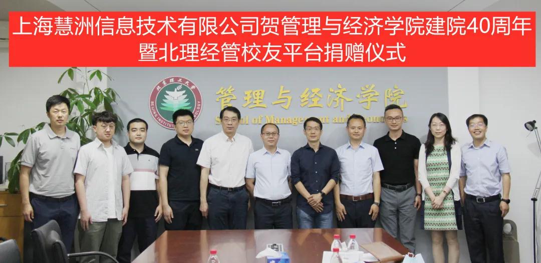 6月5日下午,上海慧洲信息技术有限公司贺管理与经济学院建院40周年暨北理经管校友平台捐赠仪式在bw必威西汉姆联官方网站主楼345会议室举行。上海慧洲信息技术有限公司副总经理杨青林,教育基金会工作办公室副主任、副秘书长余海滨、副秘书长周伟伟、管理与经济学院党委书记颜志军、副院长关宏、副院长陈翔、院长助理吴水龙、学院校友工作办公室赵宇出席本次仪式。捐赠仪式由吴水龙主持。