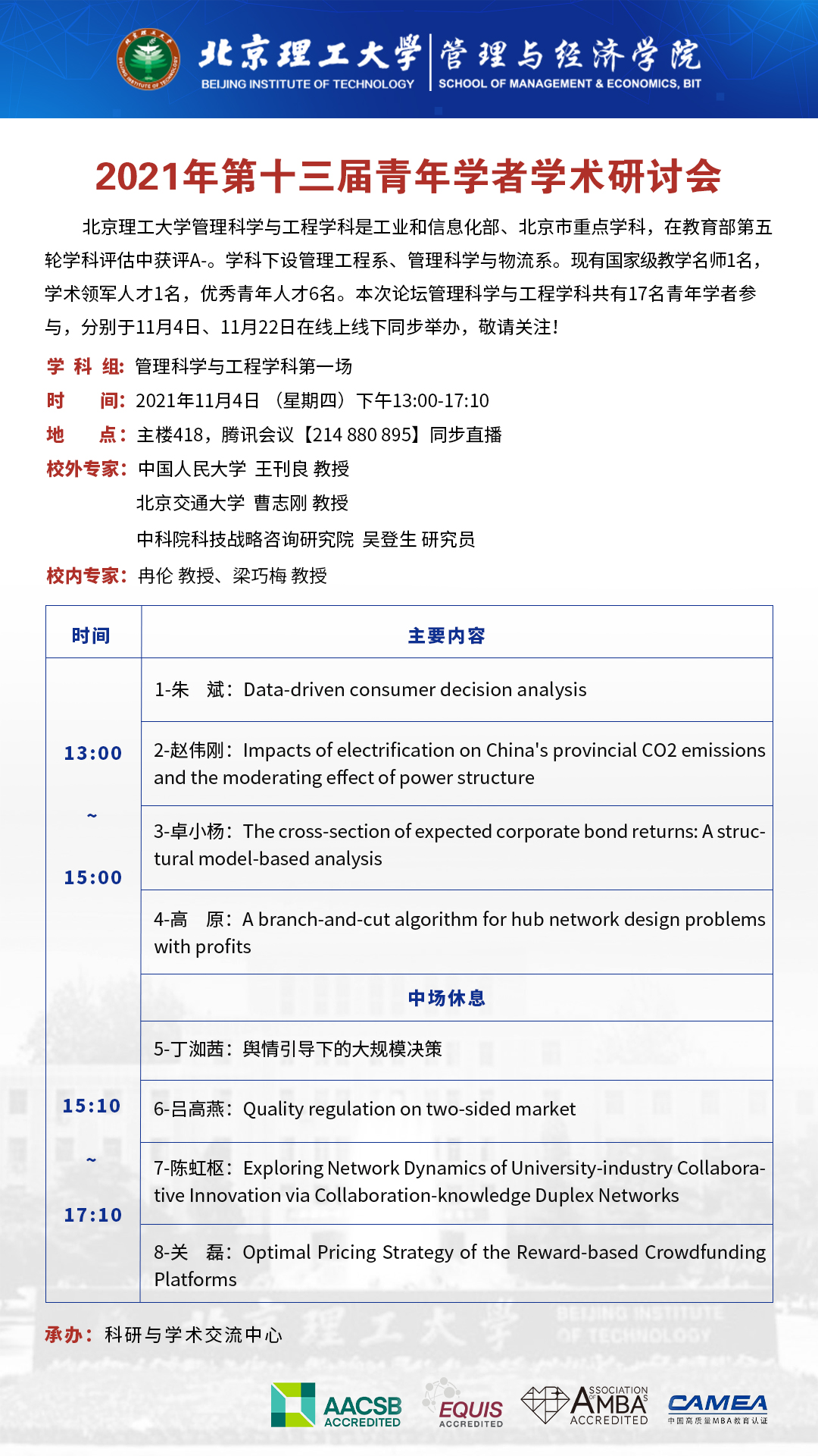 论坛介绍:bw必威西汉姆联官方网站管理与工程学科是工业和信息化部、北京市重点学科,在教育部第五轮学科评估中获评A-。学科下设管理工程系、管理科学与物流系。现有国家级教学名师1名,学术领军人才1名,优秀青年人才6名。本次论坛管理科学与工程学科共有17名青年学者参与,分别于11月4日、11月22日在线上线下同步举办,敬请关注!