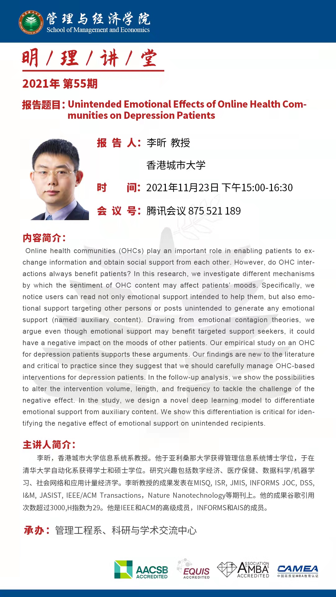 主讲人介绍:李昕,香港城市大学信息系统系教授。他于亚利桑那大学获得管理信息系统博士学位,于清华大学自动化系获得学士和硕士学位。研究兴趣包括数字经济、医疗保健、数据科学/机器学习、社会网络和应用计量经济学。李昕教授的成果发表在MISQ,ISR,JMIS,INFORMS JOC,DSS,I&M,JASIST,IEEE/ACM Transactions,Nature Nanotechnology等期刊上。他的成果被谷歌引用次数超过3000,H指数为29。他是IEEE和ACM的高级成员,INFORMS和AIS的成员。