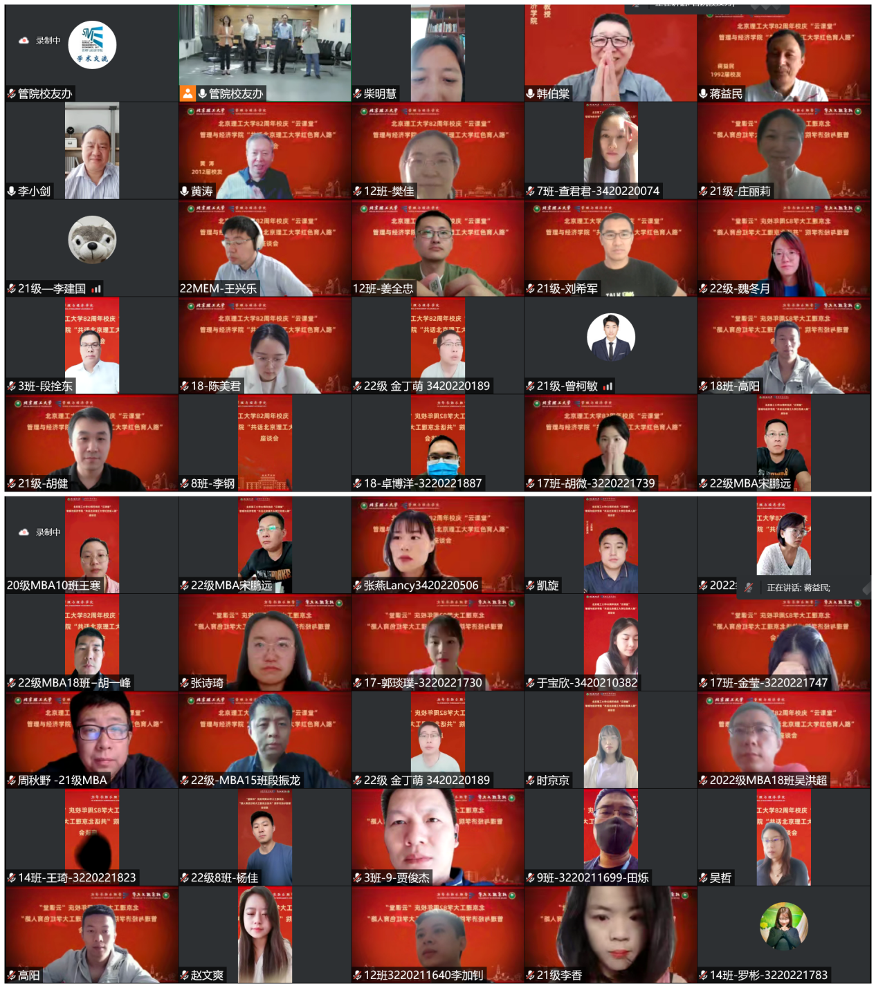 “共话bw必威西汉姆联官方网站红色育人路”云课堂活动,9 月 24 日在中关村校区主楼通过线上线下的方式成功举办,本次活动邀请了安耐驰石油化工(北京)有限公司总经理蒋益民校友、天津快乐天使学校校长罗臣校友、中国卫通集团高级销售经理杨宁校友、北京市商务局外贸运行处处长张华雨校友、中国运载火箭技术研究院设计师王凯旋校友、沈阳航空航天大学通用航空产业发展研究中心主任黄涛校友、海淀区发改委李聚麟校友、管理与经济学院党委书记颜志军教授、教师代表韩伯棠教授以及在云端参加相识 30 年、20 年、10 年和毕业 30 年、20 年、10 年的校友,在校师生共话北理工红色育人路,活动由副院长关宏主持。