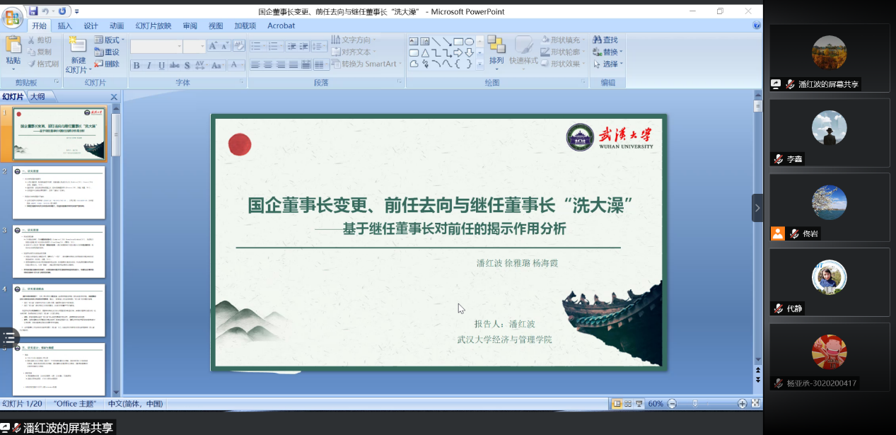 在本次报告中,潘教授首先指出:在我国市场与关系双轮驱动的背景下,可以从前后任高管间关联关系的角度探寻当前上市公司会计信息质量水平偏低的原因。基于理论分析与实证检验,研究发现继任董事长在变更当年存在“洗大澡”行为,且该效应主要发生在前任未去往控股股东单位任职时。随后,潘教授还进行了一系列稳健性检验、异质性检验以及动机检验。最后,潘教授与参会老师和同学在线上进行了热烈的讨论和交流,报告反响热烈,受到老师和同学们的一致好评。