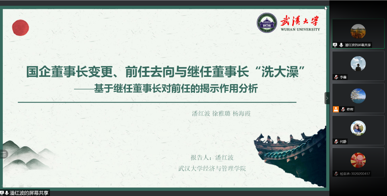 2021年5月17日,【明理讲堂2021年第24期】有幸邀请到武汉大学潘红波教授为学院师生带来题为“国企董事长变更、前任去向与继任董事长‘洗大澡’——基于继任董事长对前任的揭示作用分析”的学术报告。管理与经济学院学院和兄弟院校70余位师生参加了此次线上报告会。