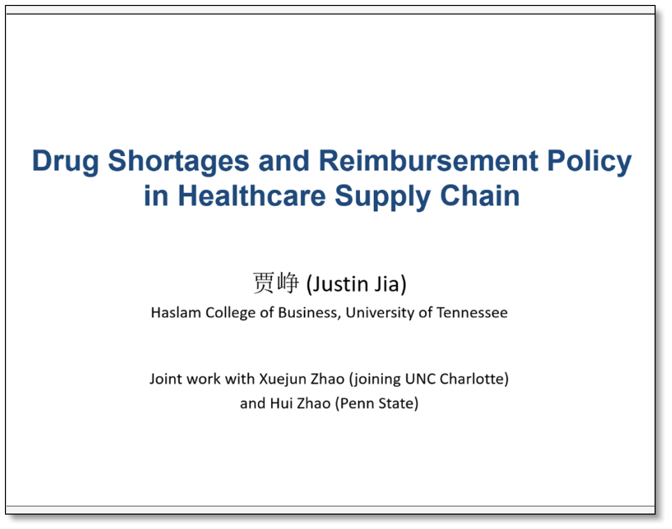 6月9日,【明理讲堂2023年第48期】有幸邀请到美国田纳西大学哈斯拉姆商学院Justin Jia助理教授为大家带来题为“医疗供应链中的药品短缺问题及其与报销政策之间的关系”的学术报告邀请。
