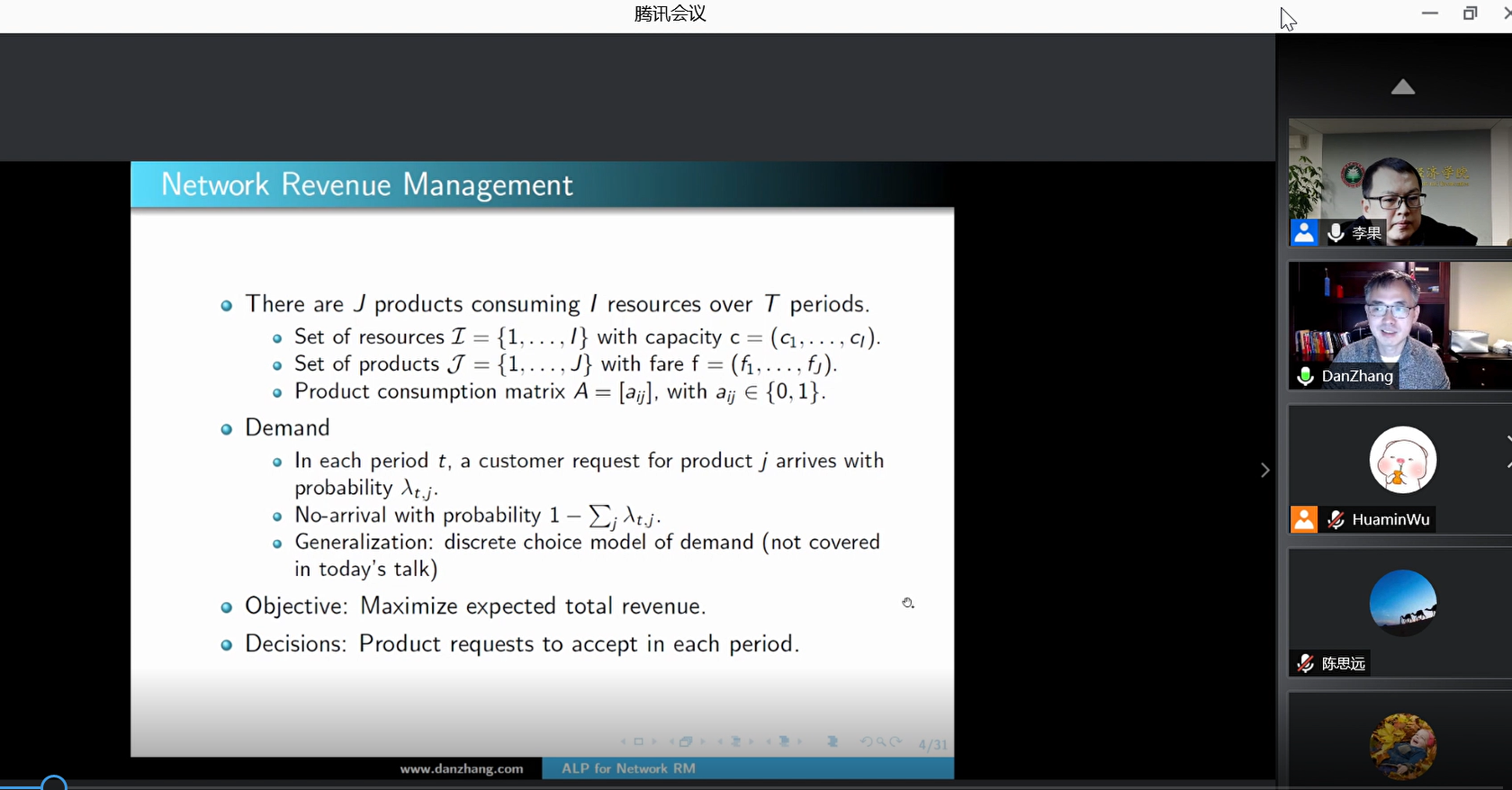 2021年1月18日,【明理讲堂2021年第11期】有幸邀请到美国科罗拉多大学博尔德分校大学Dan Zhang教授为大家带来题为“Recent Results on Approximate Linear Programming for Network Revenue Management”的学术报告,报告采用腾讯会议在线直播的形式。管理与经济学院部分领导、教师、硕博研究生等多名师生参加了本次讲座,主持人为管理与经济学院技术经济及战略管理系李果教授。
