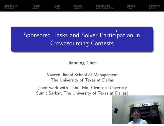 应管理与经济学院的邀请,美国德州大学达拉斯分校Naveen Jindal商学院陈建清教授于2022年12月28日上午10点在线上作了题为《Sponsored Tasks and Solver Participation in Crowdsourcing Contests》的学术报告。报告会由颜志军教授主持,学院众多师生参加了报告会。