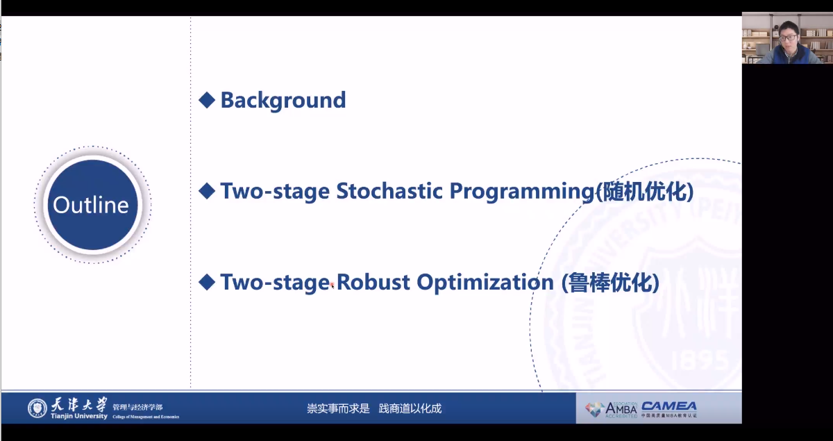 2021年12月30日,【明理讲堂2021年第76期】,我们有幸邀请到天津大学管理与经济学部朱宁副教授,带来题为“两阶段不确定优化技术及其应用”的报告。本报告以腾讯会议的形式在线上举办,吸引了超过全国各高校100余名师生参与。其中,管理与经济学院张玉利副教授、朱斌副研究员等20余名师生参加了本次讲座,并在报告结束后与朱宁老师展开交流。主持人为管理与经济学院管理科学与物流系高原副教授。