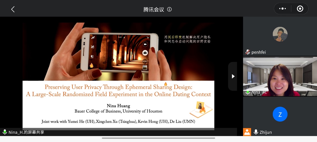1月11日,【明理讲堂2021年第4期】有幸邀请到美国休斯顿大学Bauer商学院黄妮老师为大家带来题为“Preserving User Privacy Through Ephemeral Sharing Design: A Large-Scale Randomized Field Experiment in the Online Dating Context”的学术报告。学院颜志军教授主持会议并对黄老师表示热烈的欢迎。