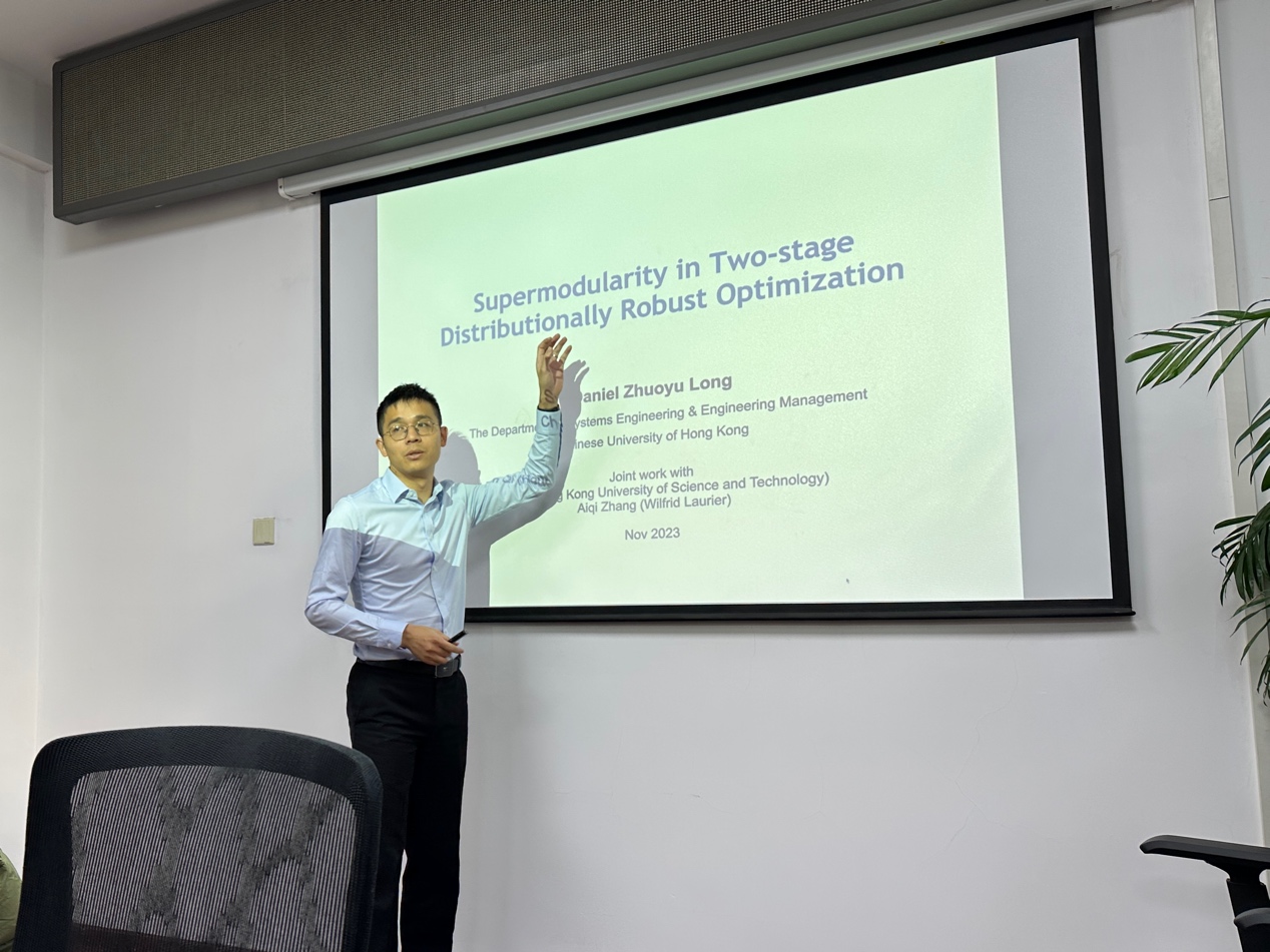 2023年11月14日下午,香港中文大学系统工程与工程管理系龙卓瑜副教授应邀,进行了题为“Supermodularity in Two-Stage Distributionally Robust Optimization”的学术报告,吸引了学院众多师生积极参与。
