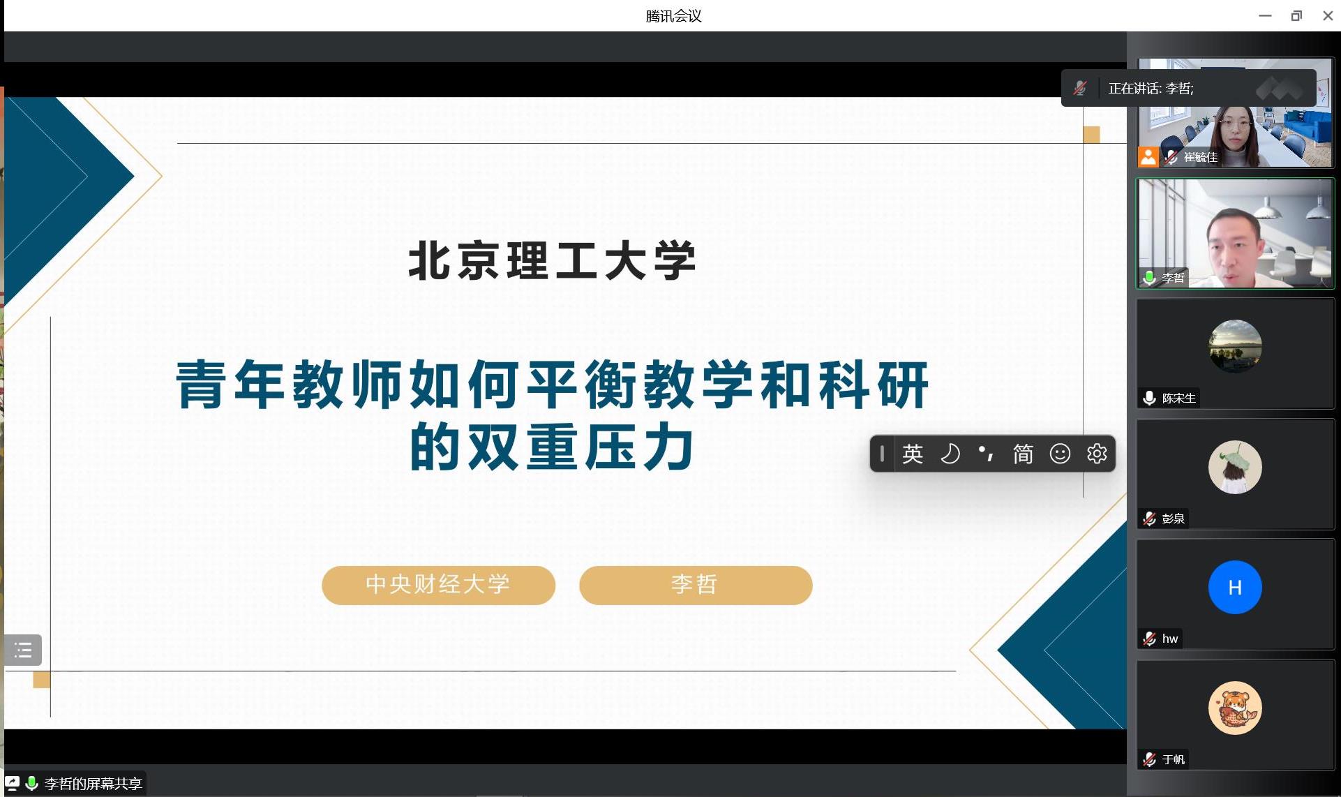 2022年10月5日,【明理讲堂2022年第38期】有幸邀请到中央财经大学会计学院李哲副教授带来题为《青年教师如何平衡教学和科研的双重压力》的报告。受疫情影响,本次报告会以线上的形式开展,管理与经济学院教师、研究生等20余名师生参加了本次报告会。主持人为管理与经济学院会计系崔毓佳助理教授。
