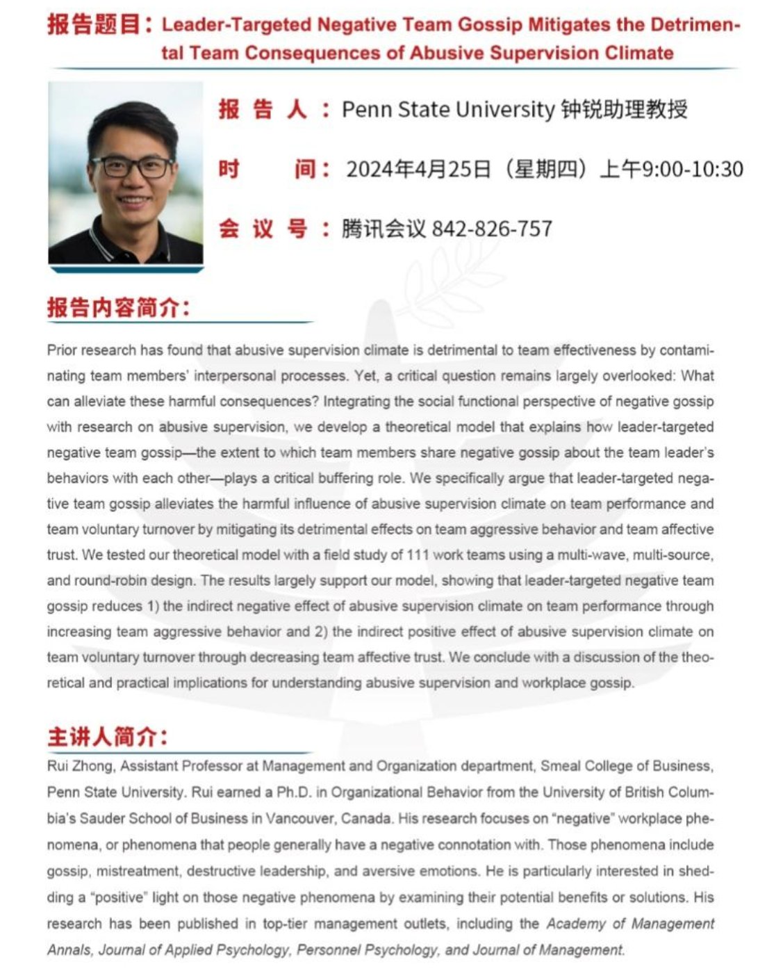 2024年4月25日上午,美国宾夕法尼亚州立大学商学院钟锐助理教授应邀到我院做题为“Leader-Targeted Negative Team Gossip Mitigates the Detrimental Team Consequences of Abusive Supervision Climate”的学术报告,报告由我院组织与人力资源管理系邓英欣助理教授主持,学院众多师生线上参加了本次报告会。