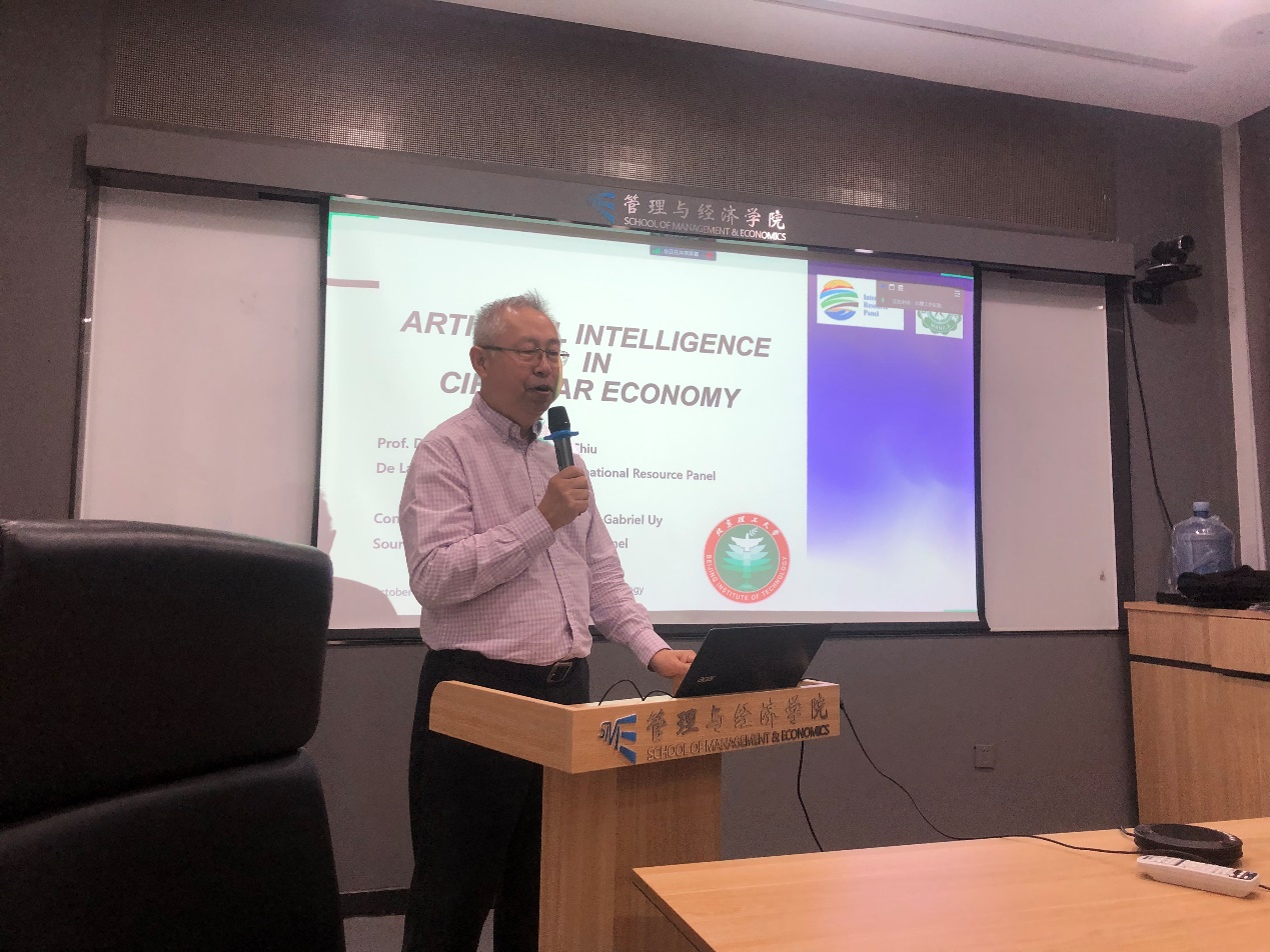 讲座中,周纯峰院士结合自己多年国际机构工作经验,分享了循环经济发展模式的理论机制和应用场景,指出相较于传统的线性经济模式,循环经济更加注重资源的有效利用和循环利用,以减少对自然资源的压力,并降低环境污染。并介绍了各国在循环经济领域的发展情况与循环经济对联合国23个可持续发展目标(SDGs)的贡献。此外,还分享了人工智能在废物管理和回收领域的应用,指出人工智能可以通过智能化的物联网设备和传感器来监测和优化资源的使用,提高资源利用效率。它可以帮助企业精确预测和规划生产需求,减少过剩和浪费;应用于废物管理和回收领域,通过智能分类和识别技术,提高废物分拣和回收的效率。