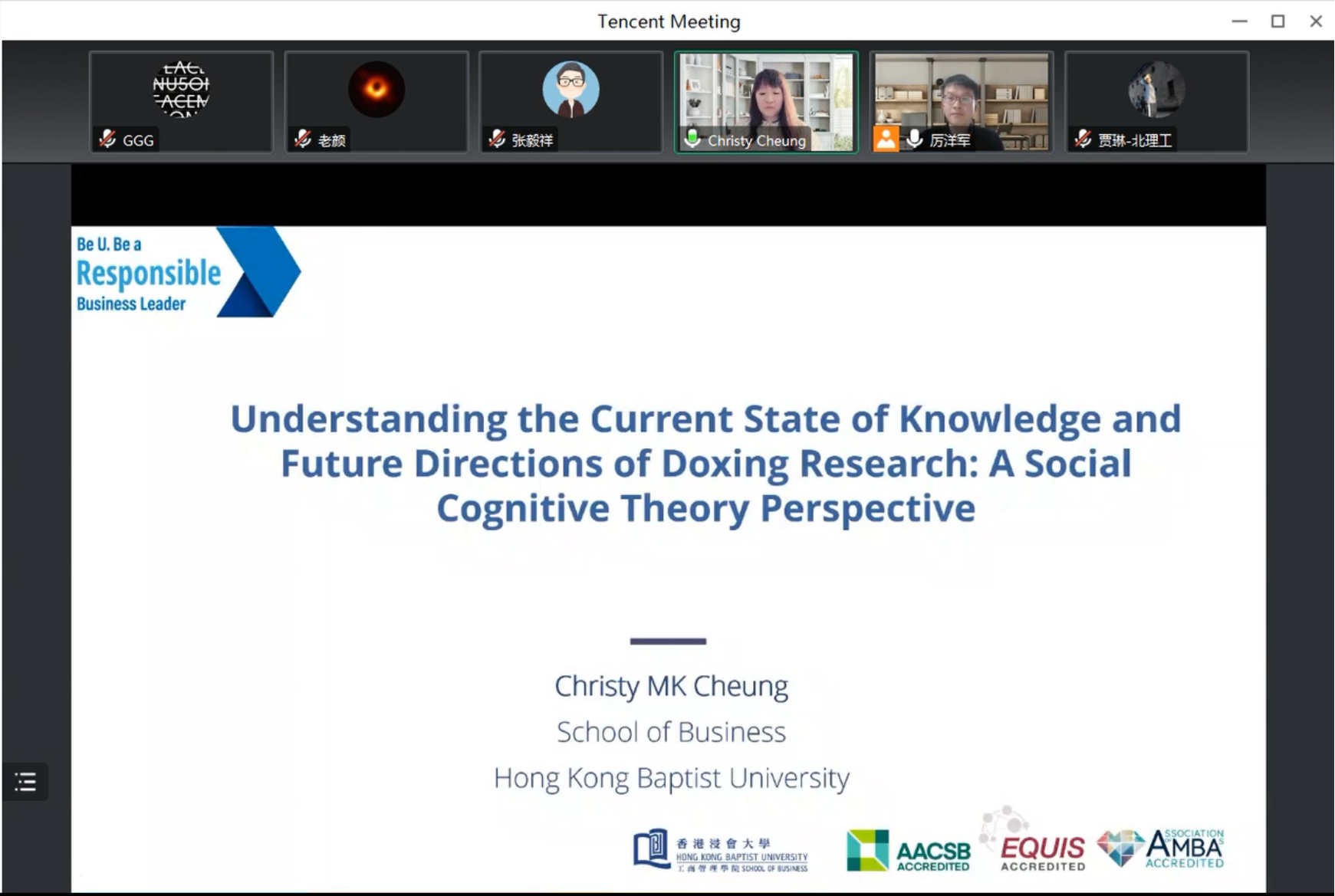 应管理与经济学院的邀请,香港浸会大学的Christy M. K. Cheung教授于2023年4月27日上午10点在线上做了题为《Understanding the Current State of Knowledge andFuture Directions of Doxing Research: A SocialCognitive Theory Perspective》的学术报告。报告会由厉洋军老师主持,学院众多师生参加了本次报告会。