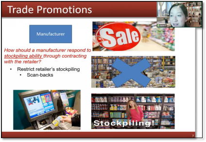 Krista教授首先指出了零售商囤货和制造商促销两种商业现象,而制造商的促销往往为零售商囤货提供了契机,导致促销没有起到应有的作用。针对以上商业现象和供应链协调问题,Krista教授构建了一个两阶段动态模型,通过比较制造商不允许、限制、允许零售商囤货三种情况下的最优决策,分析出制造商何时应该限制零售商的储存能力以及何时应该进行促销。随后,Krista教授分享了研究得到的几个重要发现:例如,过去人们认为制造商一定要限制零售商的囤货行为,而研究却表明只有在存储成本比较低的情况下,制造商才需要限制零售商囤货;再比如,以往制造商不清楚什么时候要促销,而本研究发现当零售商不能囤货并且产品的存储成本比较低的情况下,制造商可以采取促销;最后,本研究提出了零售商囤货一定程度上改善了渠道协调,增加了制造商的利润,因此制造商应将产品设计为更易于储存。