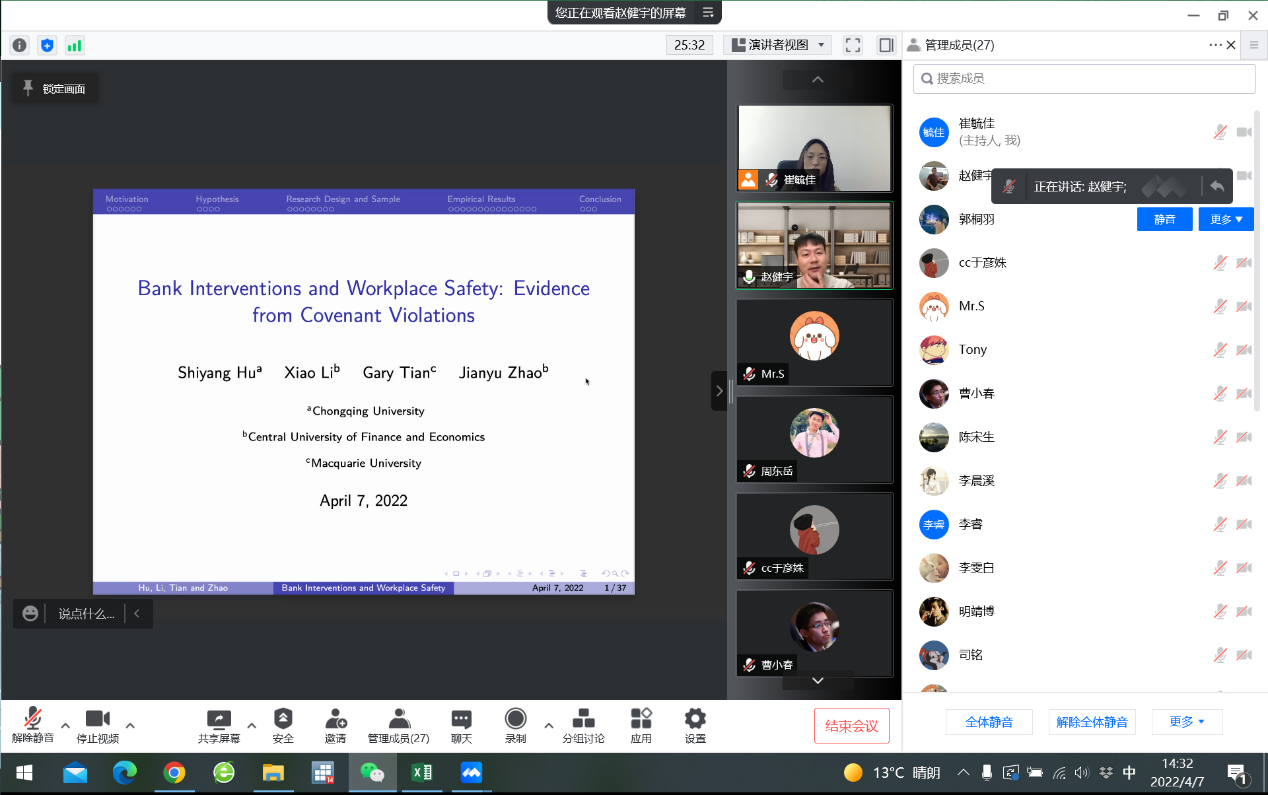 2022年4月7日,【明理讲堂2022年第17期】有幸邀请到中央财经大学会计学院赵健宇助理教授带来题为《银行治理与员工生产安全》的报告。受疫情影响,本次报告会以线上的形式开展,管理与经济学院教师、研究生等20余名师生参加了本次报告会。主持人为管理与经济学院会计系崔毓佳助理教授。