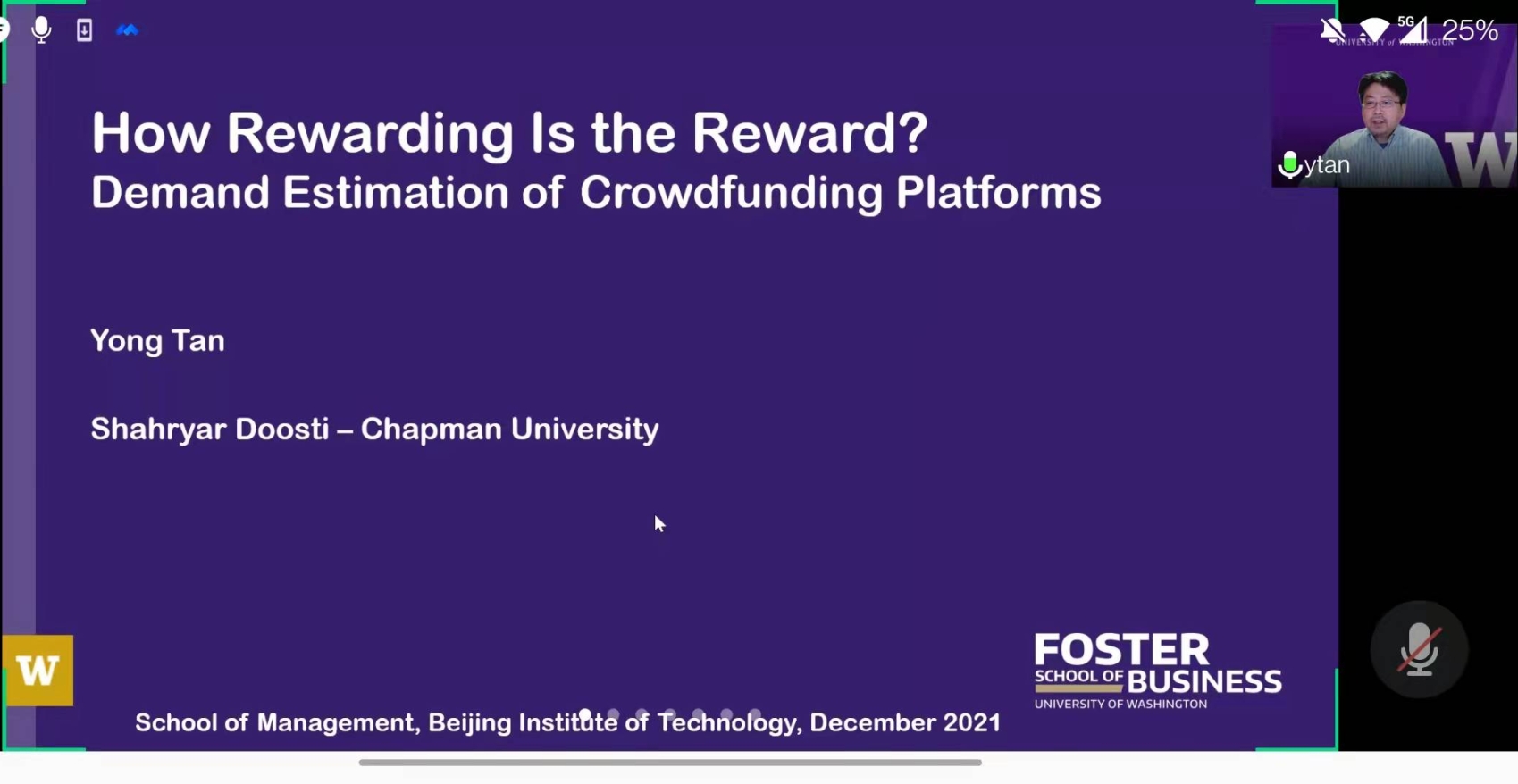 12月20日,【明理讲堂2021年第68期】有幸邀请到华盛顿大学福斯特商学院谭勇教授为大家带来题为“How rewarding is the reword? Demand estimation of crowdfunding platforms”的学术报告。bw必威西汉姆联官方网站管理与经济学院教授颜志军向大家介绍了谭勇老师并主持报告。