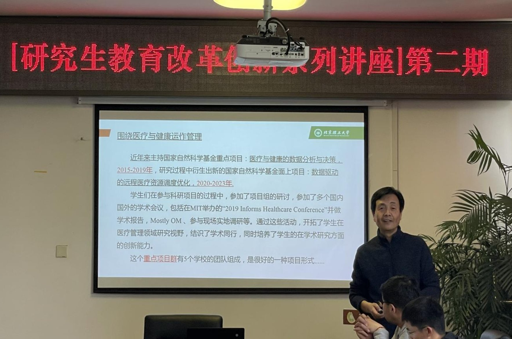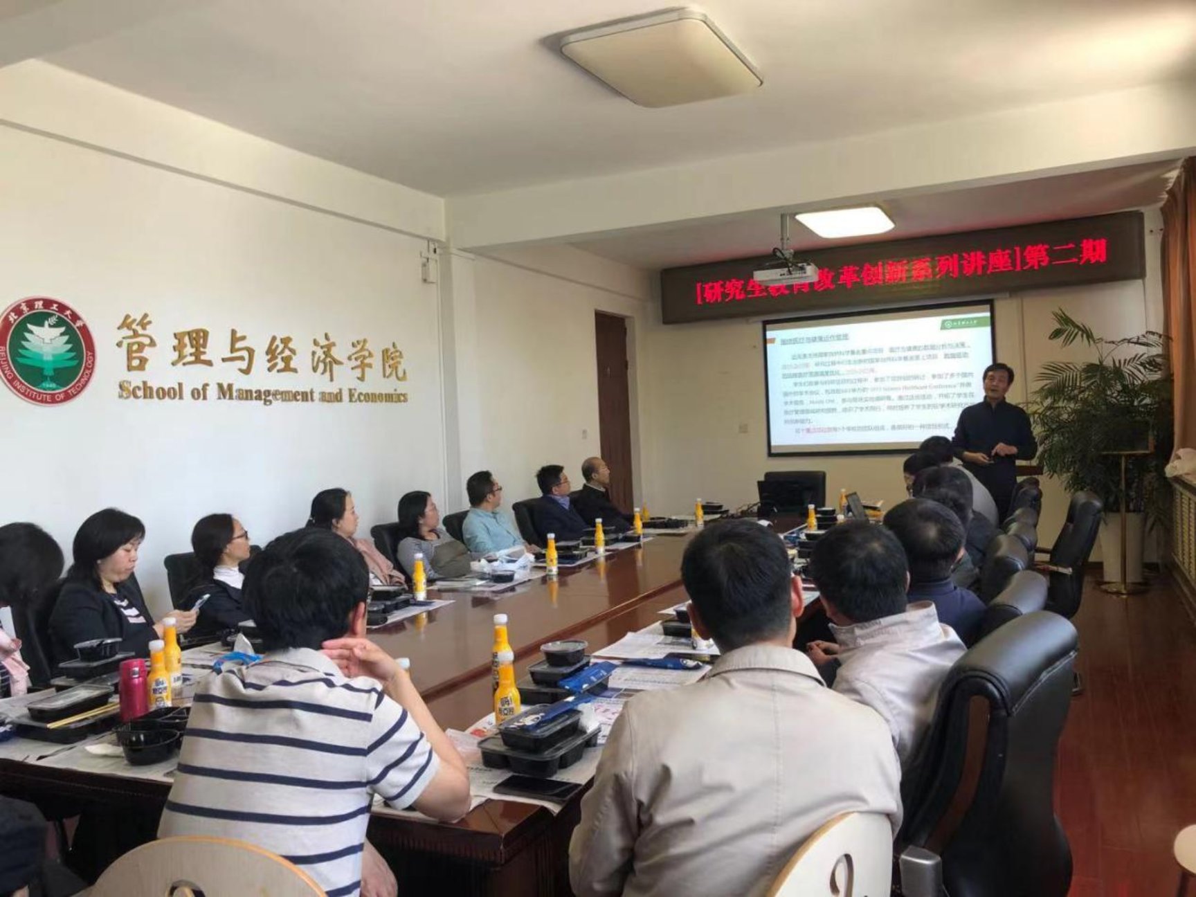 2021年5月7日,“研究生教育改革创新系列讲座”第二讲在主楼418举行。管理与经济学院教授、博士生导师,校人文与社科学部主任李金林教授应邀做了题为“提高研究生培养质量的几点体会”的教学讲座,结合自己多年来对研究生培养的研究思考和教学实践,向与会教师进行了经验传授和交流。王兆华院长、张祥副院长、赵先副院长和学院教师共20余人参与了此次讲座。讲座由邓剑伟副教授主持。