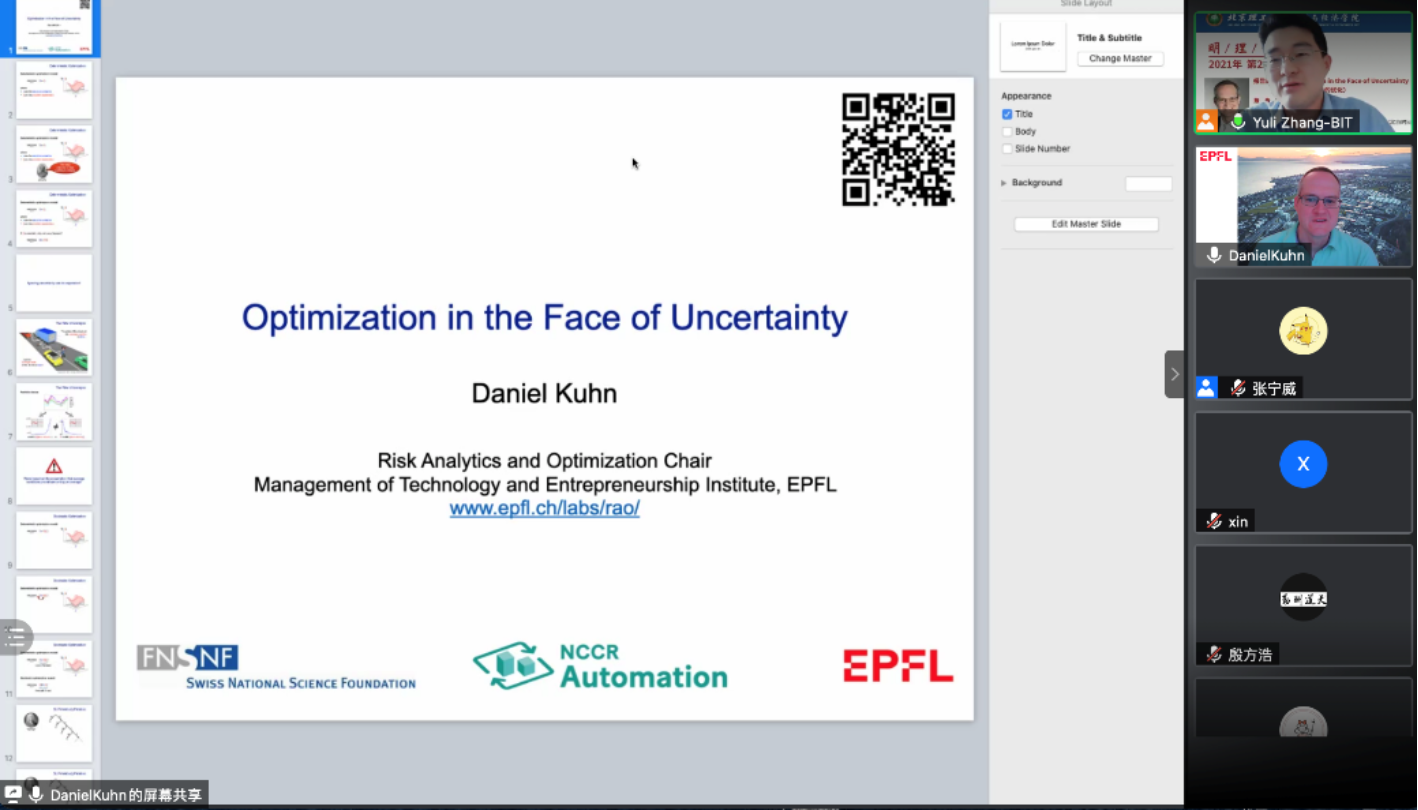 2021年5月7日,【明理讲堂2021年第22期】有幸邀请到瑞士洛桑联邦理工学院(EPFL)Daniel Kuhn教授带来题为“Optimization in the Face of Uncertainty”的学术报告。报告采用腾讯会议的形式。管理与经济学院教师、研究生以及校外研究学者等300多名师生参加了本次讲座,主持人为管理与经济学院管理工程系张玉利副教授。