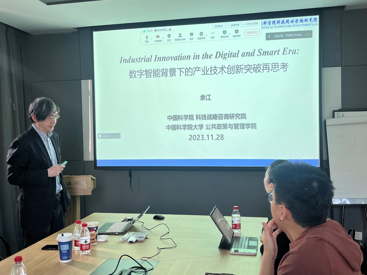 2023年11月28日上午,应技术经济与战略管理系邀请,中国科学院科技战略咨询研究院产业科技创新研究中心执行主任余江研究员应邀请进行了题为“数字智能背景下的产业技术创新突破再思考”的学术报告,吸引了院内外众多师生积极参与。