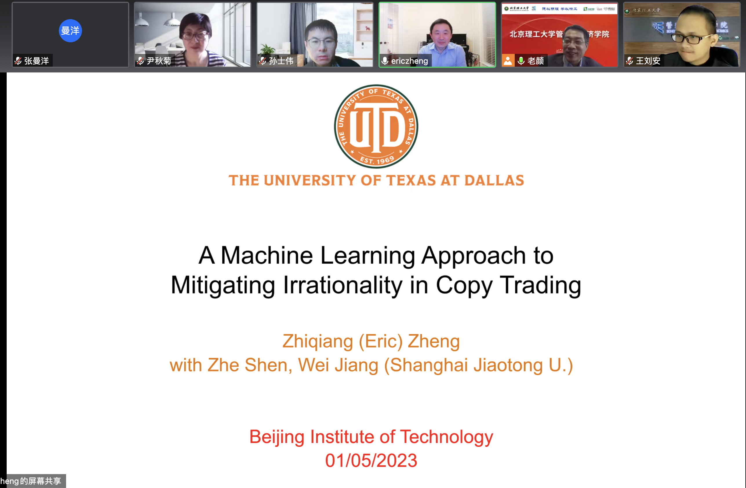 应管理与经济学院的邀请,美国德克萨斯大学达拉斯分校Jindalbetway西汉姆联官网ZhiqiangZheng教授于2023年1月5日上午10点在线上作了题为《A Machine Learning Approach to Mitigaing Irrationality in Copy Trading》的学术报告。报告会由颜志军教授主持,学院众多师生参加了报告会。