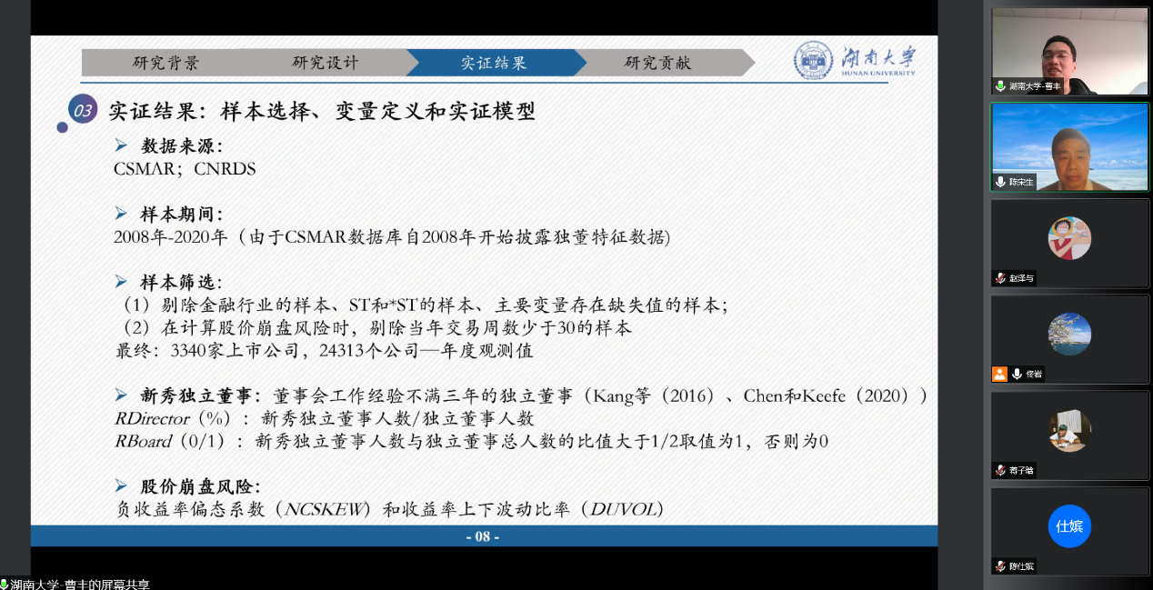 11月23日下午,【明理讲堂2021年第73期】有幸邀请到湖南大学曹丰副教授带来题为“新秀独立董事与股价崩盘风险”的学术报告。受疫情影响,本次报告会以线上的形式开展,管理与经济学院教师、硕博研究生参加了本次报告会。