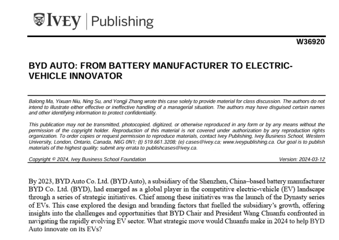 3月12日,由我校管理与经济学院马宝龙教授、张永冀副教授等开发撰写的教学案例《BYD: From Battery Manufacturer to Electric VehicleInnovator》正式被国际顶尖案例机构——毅伟案例库(Ivey Publishing)收录。该案例描述了比亚迪从一家电池制造商发展成为全球领先的电动汽车制造商的过程。