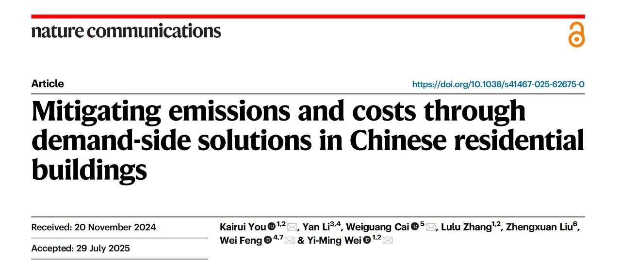 论文详情:You, K., Li, Y., Cai, W. …. Wei, YM., et al. Mitigating emissions and costs through demand-side solutions in Chinese residential buildings. Nat Commun 16, 7358 (2025). https://doi.org/10.1038/s41467-025-62675-0