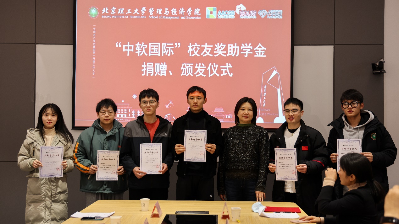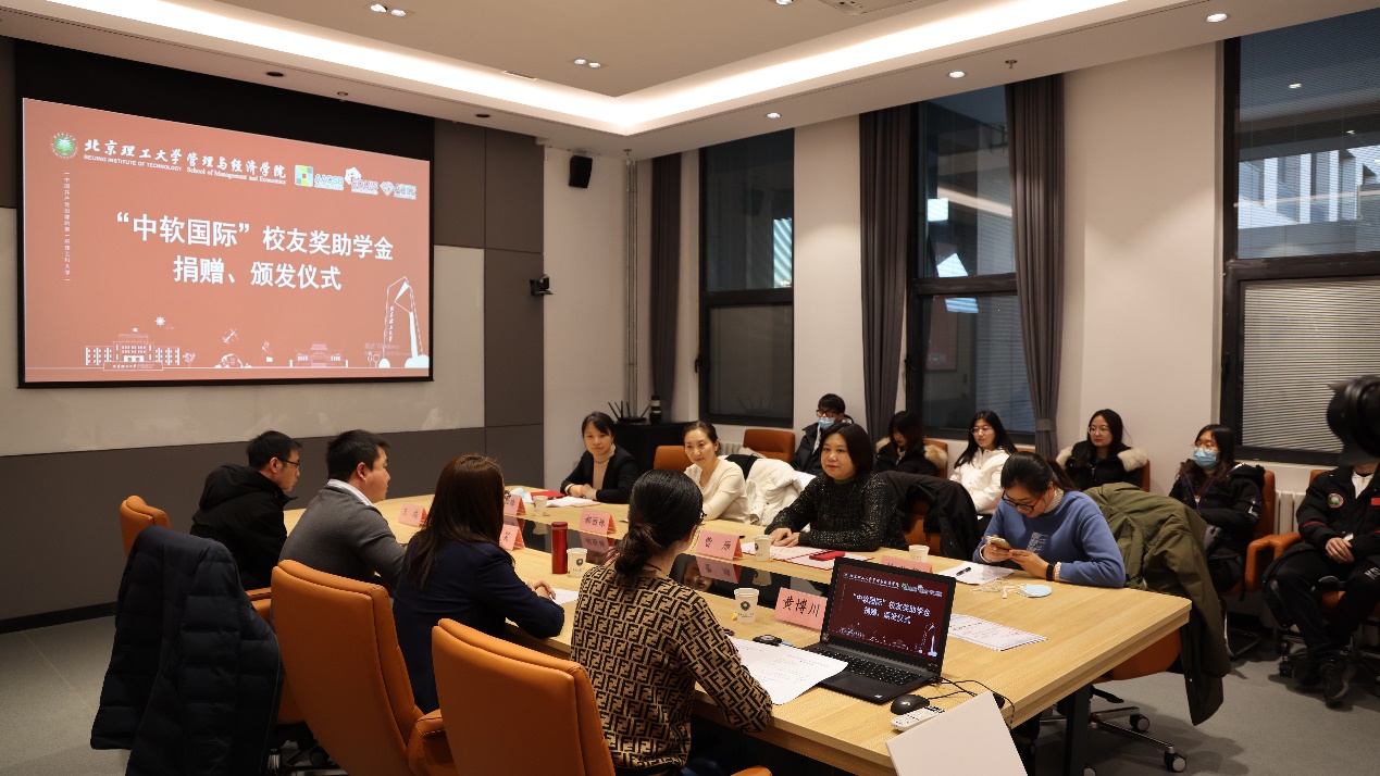 2021年12月18日,管理与经济学院“中软国际”校友奖助学金捐赠、颁发仪式在bw必威西汉姆联官方网站良乡校区文四办公楼216室举行。中软国际党委委员、高级副总裁、技术与专业服务集团总裁曹雁,党委副书记、员工关系管理部总监郝丽姝,互联网+业务群HRD蒯红梅,信创学院综合办公室徐秋华,管理与经济学院副书记副院长彭明雪、辅导员王鸿、黄博川及20名学生参加了此次活动,活动由研工委书记梁昊主持。