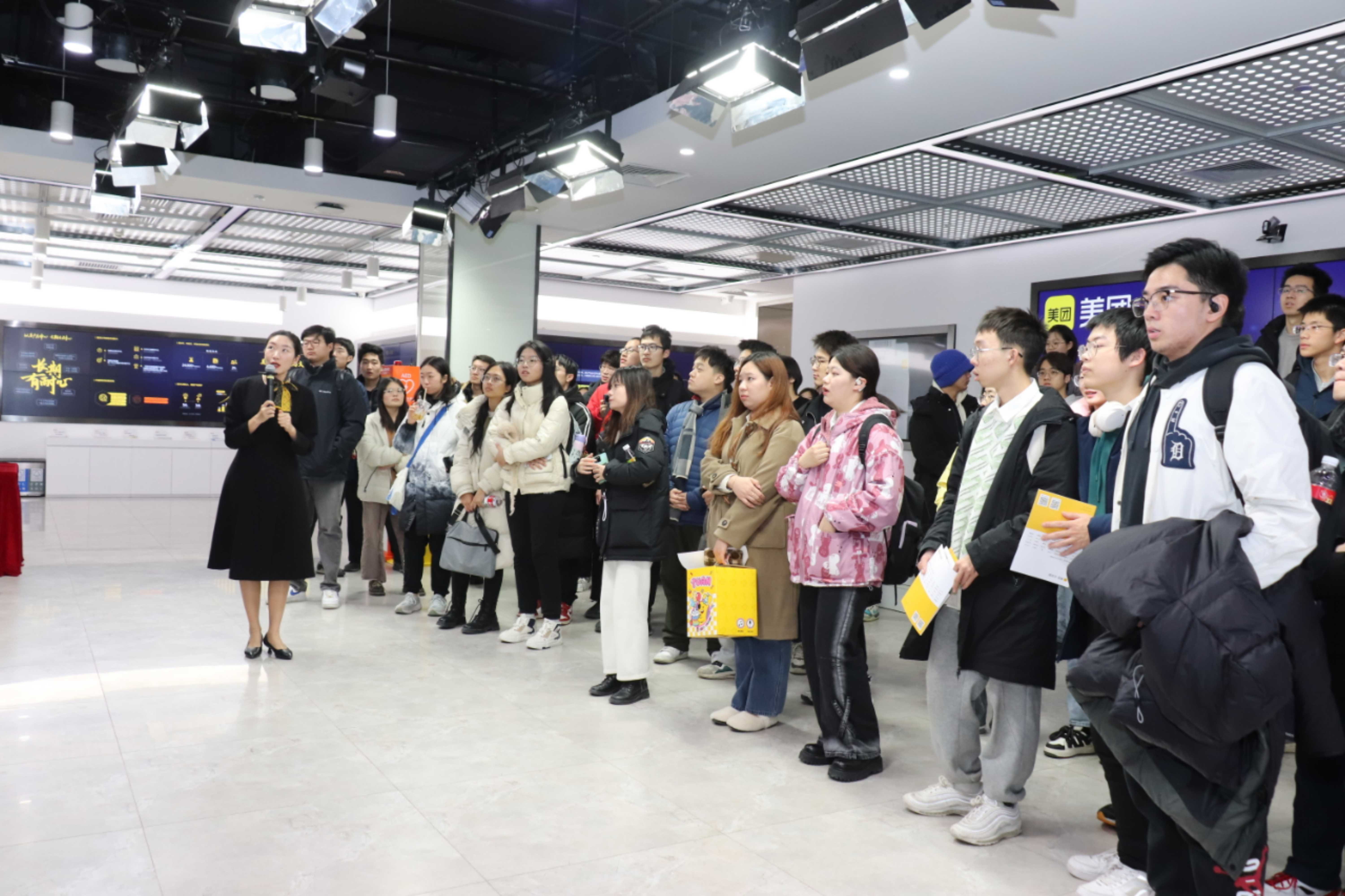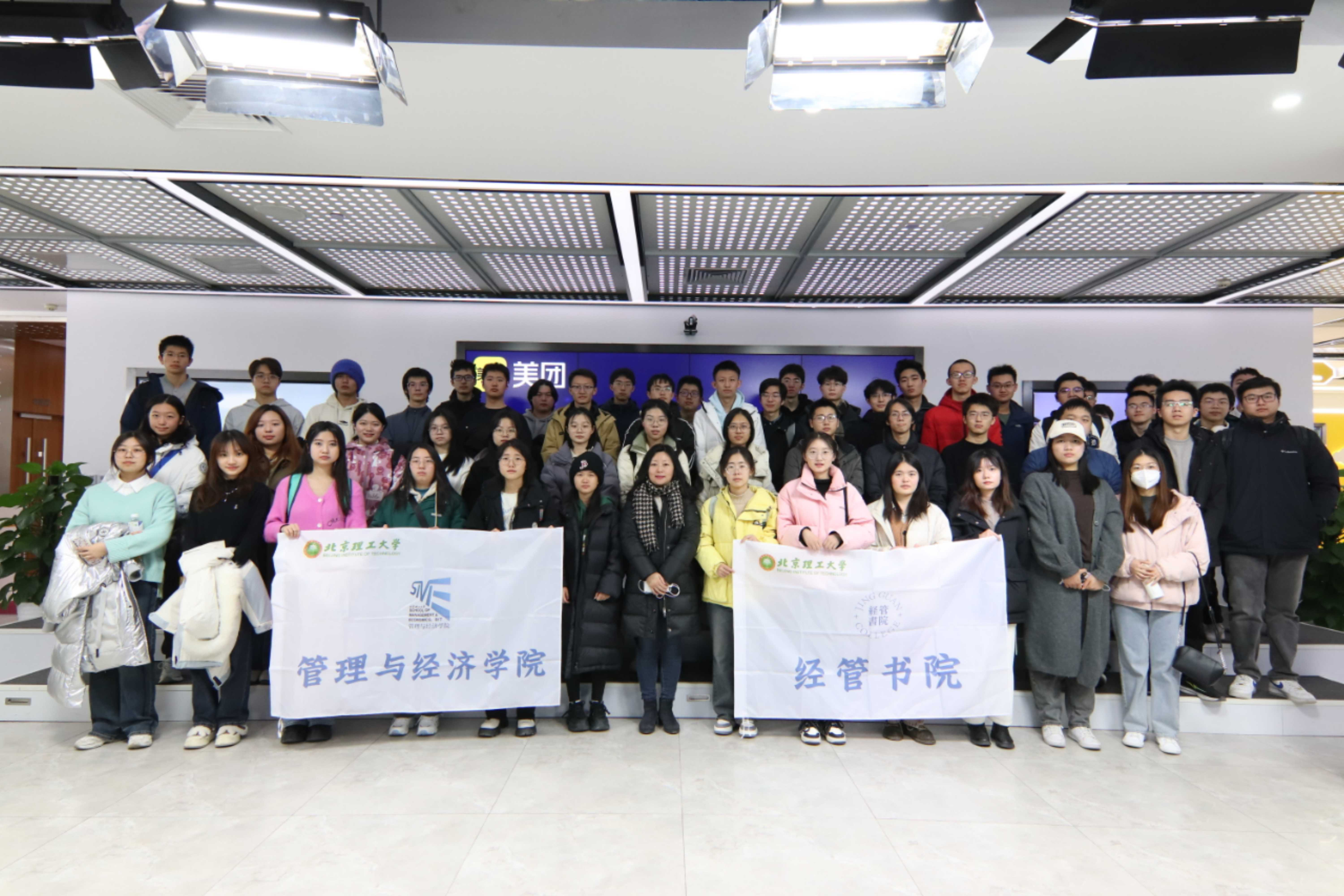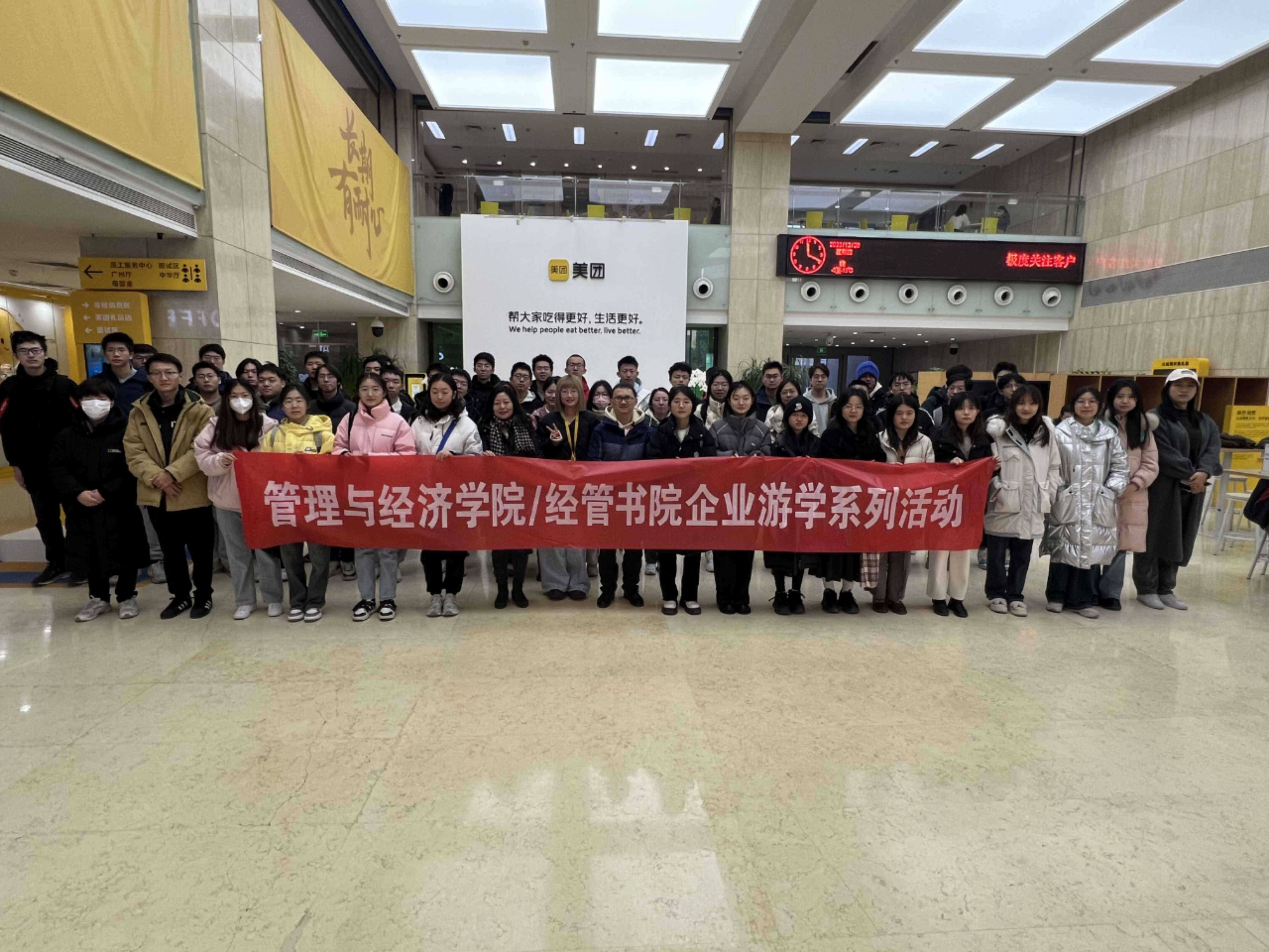 2023年12月28日,bw必威西汉姆联官方网站管理与经济学院组织了本科生“企业游学”的参观活动,本次走进的企业是位于北京市望京科创园的美团总部。由信息管理与信息系统专业的高慧颖老师和王刘安老师带队,来自信息管理与信息系统(含大数据管理方向)大三的同学、信息管理与信息系统+英语联合学士学位大一和大二的同学、工商管理+人工智能双学位专业以及部分徐特立学院大一同学共计54名同学参与了本次活动。