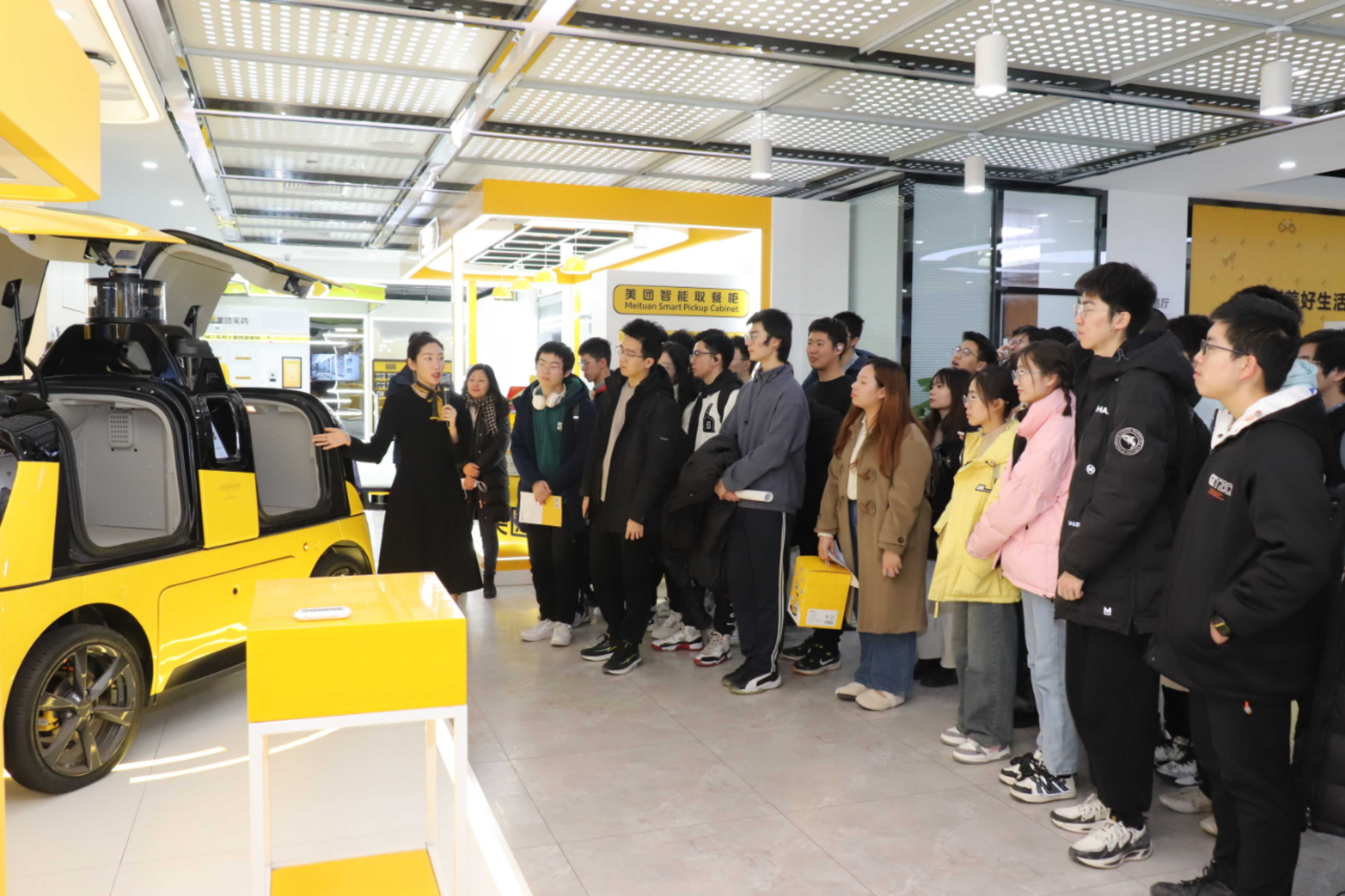接下来,讲解员带领大家参观了美团研发部门研发出的许多新型设施。这些设施有的已经在全国部分地区试点投放,并且取得了好评,给当地人们带来了便利;有的设施在当前投放版本的基础上升级,兼顾安全性能和实用性能,助力人们的日常生活。从美团智能配送车到智能配送无人机;从一站式自动酒店入住办理系统到24小时智能买药机器,同学们感慨着科技改变生活,也暗自思考着自己所学专业能为未来社会变得更美好做出什么样的贡献。