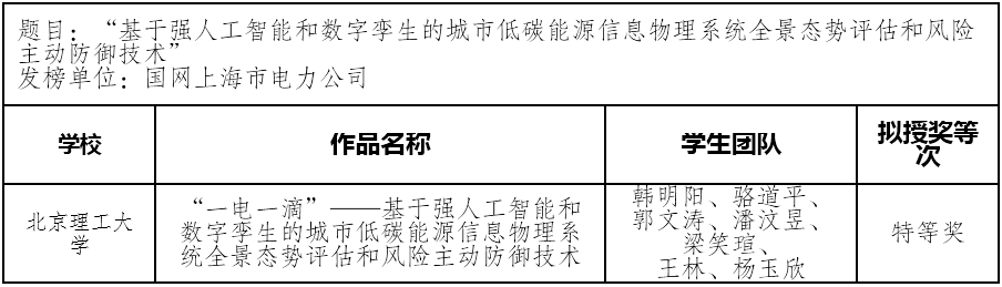 2024年11月20日,第十九届“挑战杯”全国大学生课外学术科技作品竞赛2024年度“揭榜挂帅”全国决赛在浙江圆满落幕,由我院从荣刚教授、韩特副教授、刘渊副研究员指导的《“一电一滴”——基于强人工智能和数字孪生的城市低碳能源信息物理系统全景态势评估和风险主动防御技术》团队,经过资格审查、作品初审和终审决赛等环节,从1414个包括硕士生组和博士生组在内的终审参赛项目中脱颖而出,荣获第十九届“挑战杯”全国大学生课外学术科技作品竞赛2024年度“揭榜挂帅”专项赛特等奖,团队成员由韩明阳、骆道平等7位本科生组成,充分展示了我院师生扎实的学术素养和卓越的创新能力。
