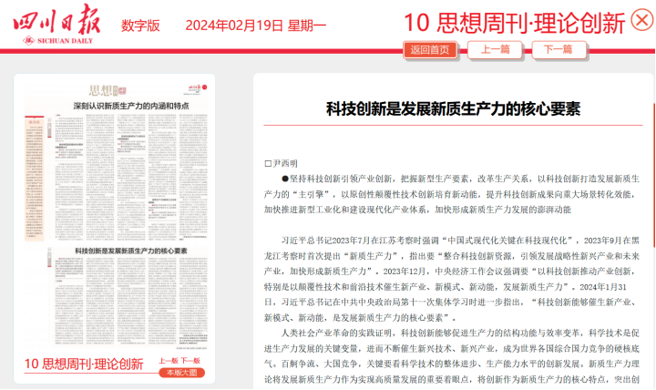 《四川日报》思想周刊·理论版特邀科技创新管理理论与政策学者尹西明老师围绕“科技创新与新质生产力”,撰写理论文章《科技创新是发展新质生产...
