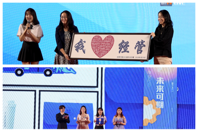在本次晚会上,学院发布了2023届毕业纪念品。代表着温暖与关怀的保温杯,以校车和经管吉祥物为设计元素的U盘以及毡毛礼品包......蓝色的礼盒象征着智慧与希望,祝愿毕业生们在新的人生旅途用智慧开创美好未来!同时,2023届全体毕业生向学院赠送了由姓名组成的“我爱经管”云图,以感谢学院全体教职工为大学生活的保驾护航。管理与经济学院副书记、副院长彭明雪,副院长关宏代表学院上台接收礼物。