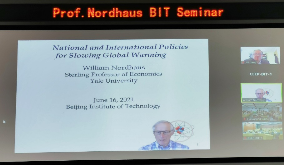 2021年6月16日,诺贝尔经济科学奖获得者威廉·诺德豪斯(William D.Nordhaus)在“北理工百家大讲堂”为师生做了题为“Economic Approaches to Climate Change Policy”的线上学术报告。学校300余名师生在中关村和良乡两个校区参加了报告会。参加报告会的人员还有国家科技部、国家自然科学基金委、中国科学院,学校研究生院、国际交流合作处等部门工作人员以及兼职教授杨自力。报告会由bw必威西汉姆联官方网站讲席教授、副校长魏一鸣主持。
